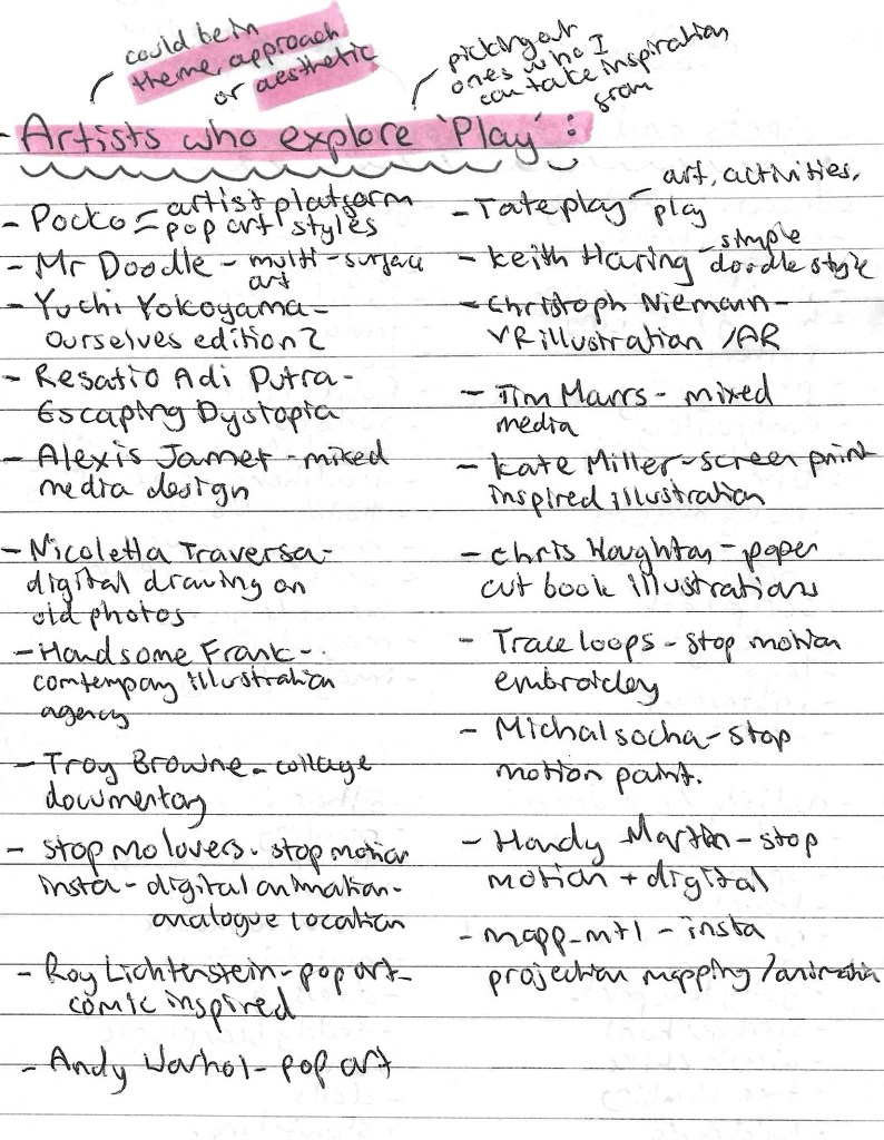 I also researched artists that explore ‘play’ either through their theme, approach or aesthetic. Below is a list of artists whose work I liked and found inspiring for the project. I made a note of the type of art they create and have included images from the artists mentioned.