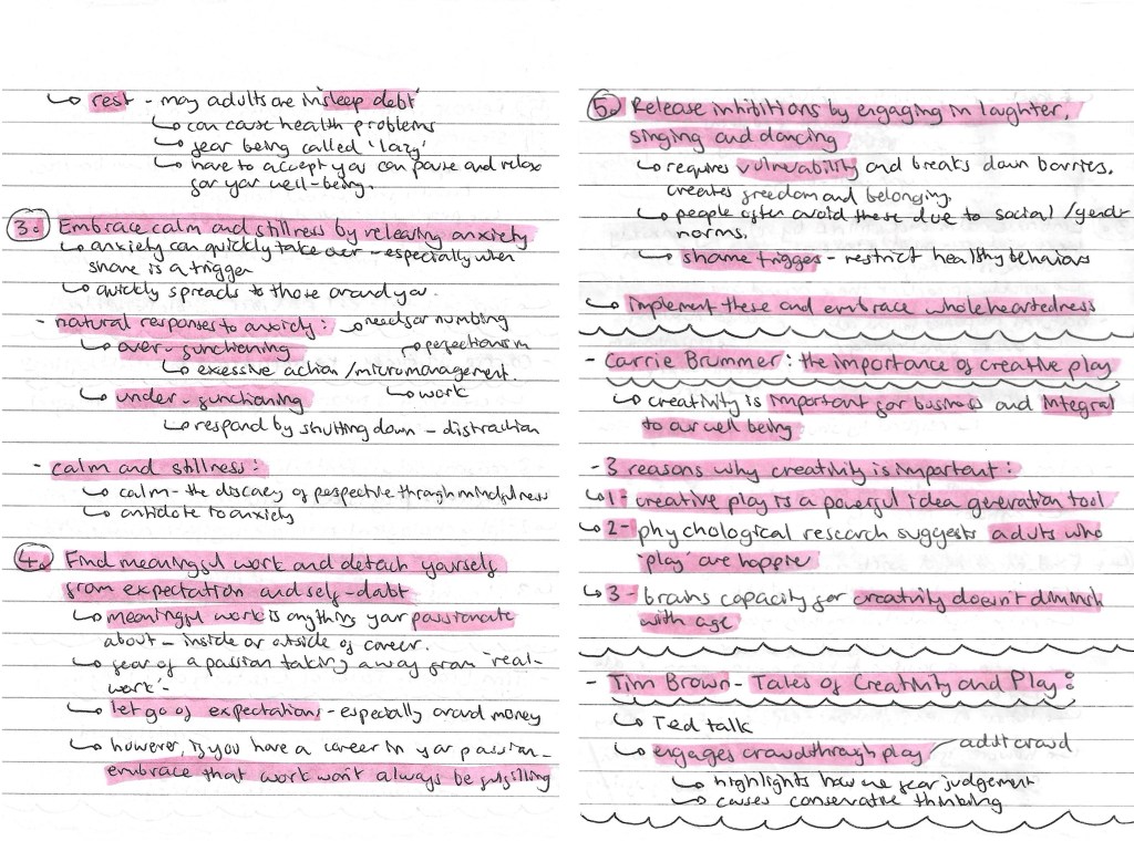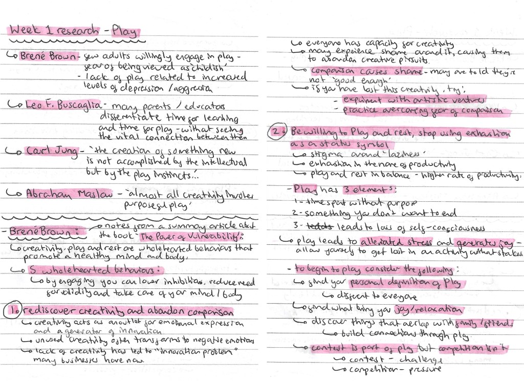 On one of the slides from the power point, there was a list of people who have studied ‘play’, I wrote down their names and the key quote from them. I researched each of them and found Brene Brown’s ideas particularly interesting. He wrote an article called ‘The Power of Vulnerability’ and within this he talks about 5 wholehearted behaviours that promote a healthy mind and body, which I made notes on. I also looked at a couple other people including Carrie Brummer and Tim Brown. The notes on all of these can be found below: