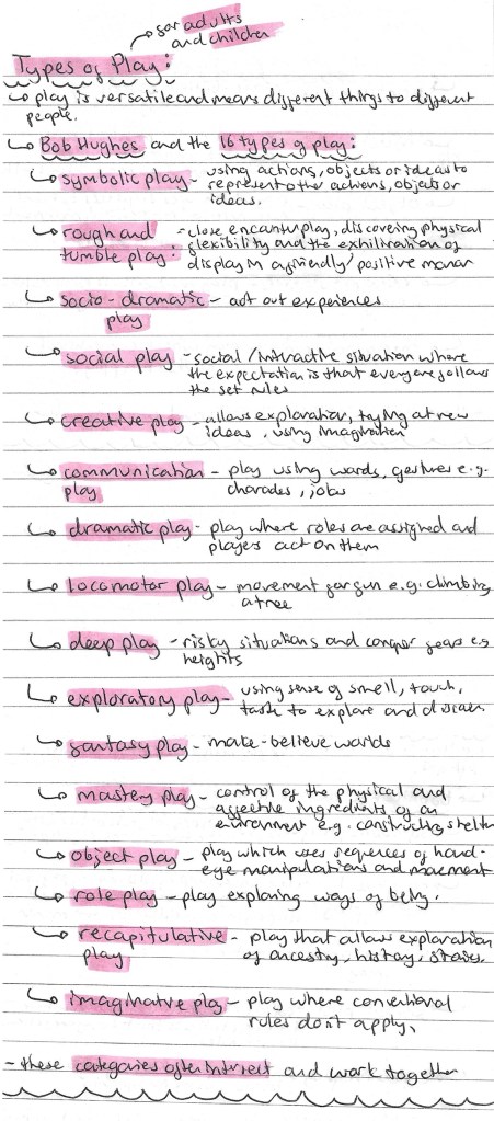 To get a comprehensive understand of what it means to ‘play’, I researched the different types of play for both adults and children. I used Bob Hughes’s article about the 16 different types of play.