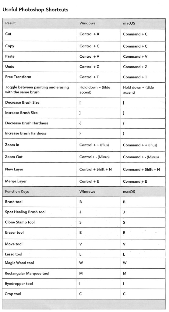 Below is a table of key Photoshop shortcuts across different devices: