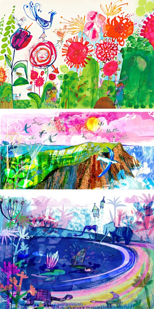 Jill Calder: her style is really fun with lots of brightly coloured elements all layering up to create a busy composition. It has a looseness to the mark making that I find appealing, this coupled with the colours helps to create a magical feeling to artwork. There is a nice hand made quality to these mark and textures.