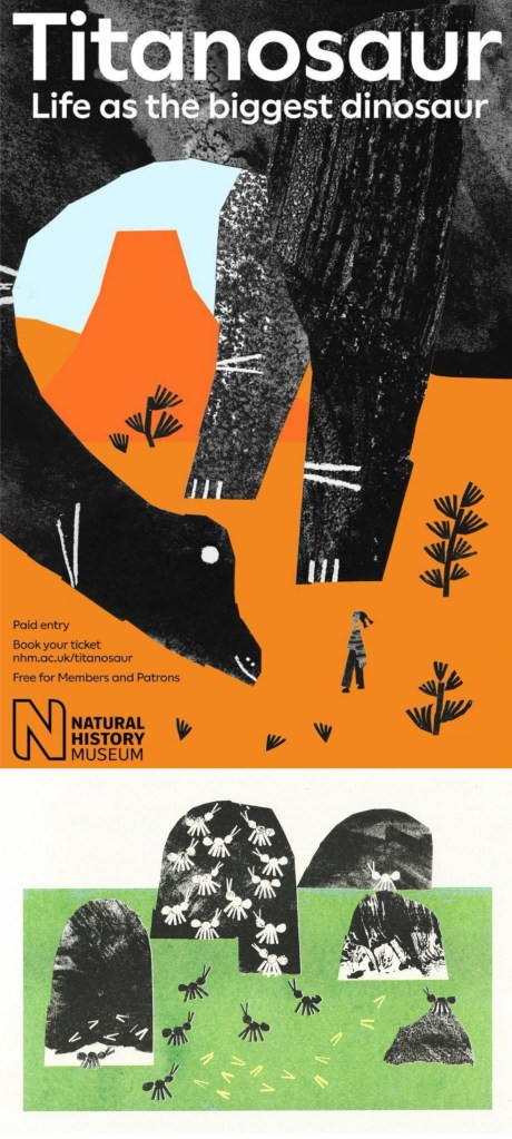 Maria Midttun: the printed textures are created by hand, scanned in and manipulated digitally. This helps to ground the digital collage in a traditional collage style. I like the contrast between the rough cut, block coloured backgrounds with the greyscale textures used to make the characters.