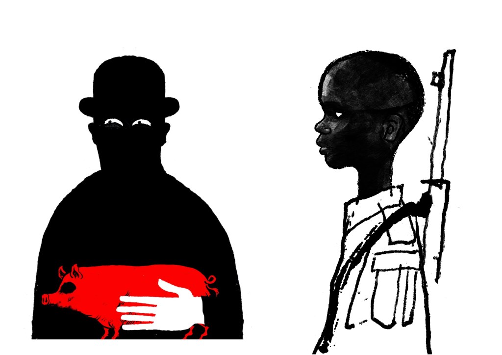David Foldvari: these pieces have a really nice quality of marks with rough inky lines being mixed with detailed shaded parts. The controlled minimal use of colour helps to draw the viewer into a certain part with the striking red standing out on the black and white.