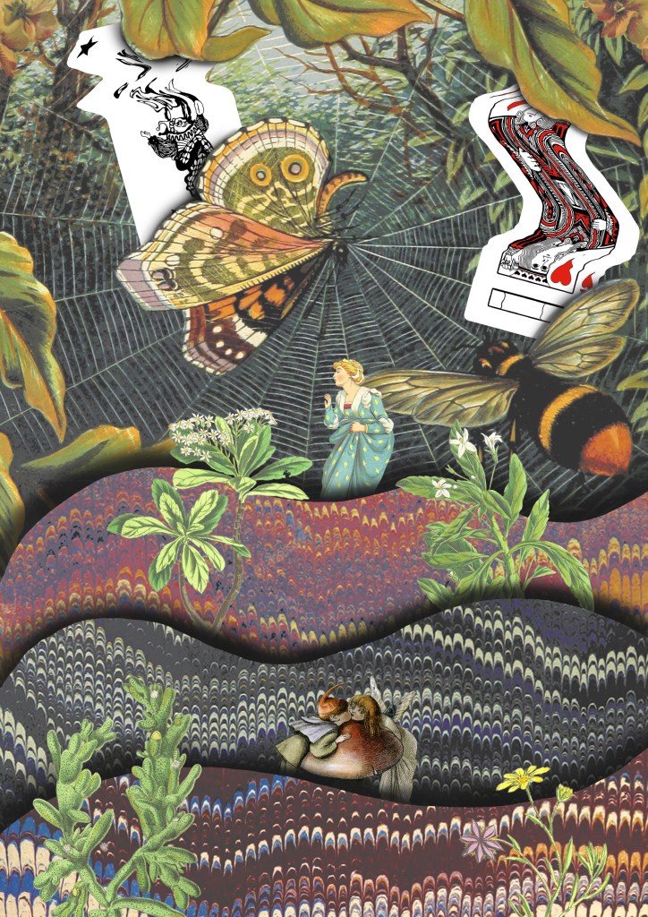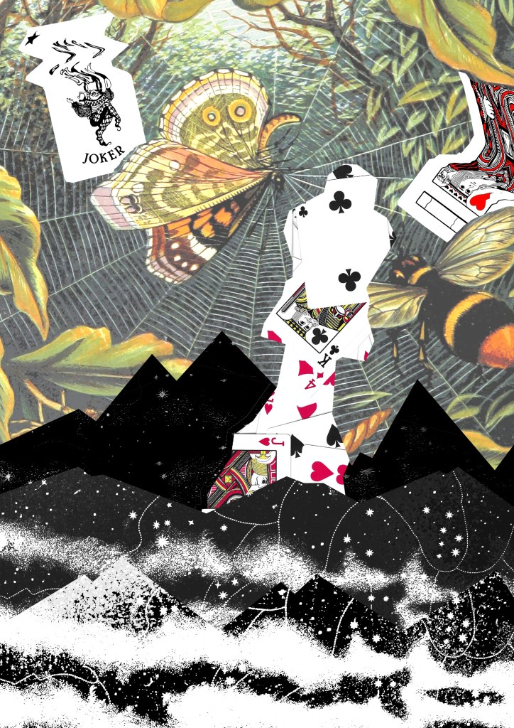 5. I drew on the ideas from images 3 and 4 and combined them with some of the visual elements from image 1, the cards and background. Theres a juxtaposition between the visual language of the images from Flickr and my experimental card scans. I was able to balance these contrasting elements by maintaining the same playful and fantasy style. I used a lot of the Photoshop tools we discussed in the workshop to create this including, selection tools, layering, brushes and editing the colours.