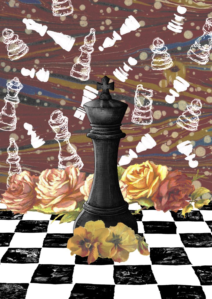 6. The previous collages has a playful concept whereas this one I went for a more obvious depiction on play by using my chess piece illustrations and Lino printed board. I combined these with a background and floral images from Flickr. The concept of this collage was that the black chess piece had one the game and all the white pieces in the background are ghosts. These one challenged me to combined multiple contrasting visual aesthetics into one collage.