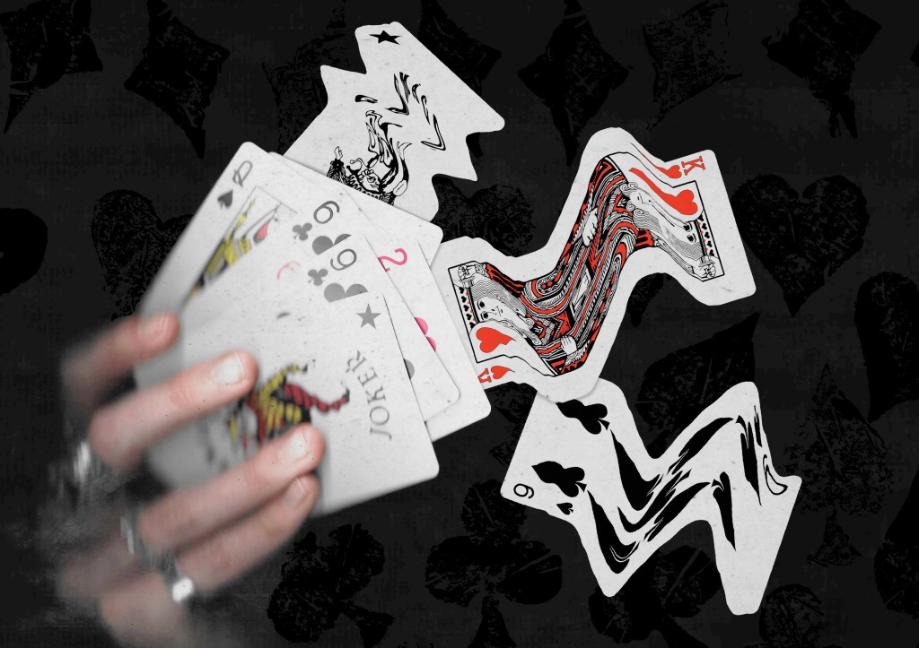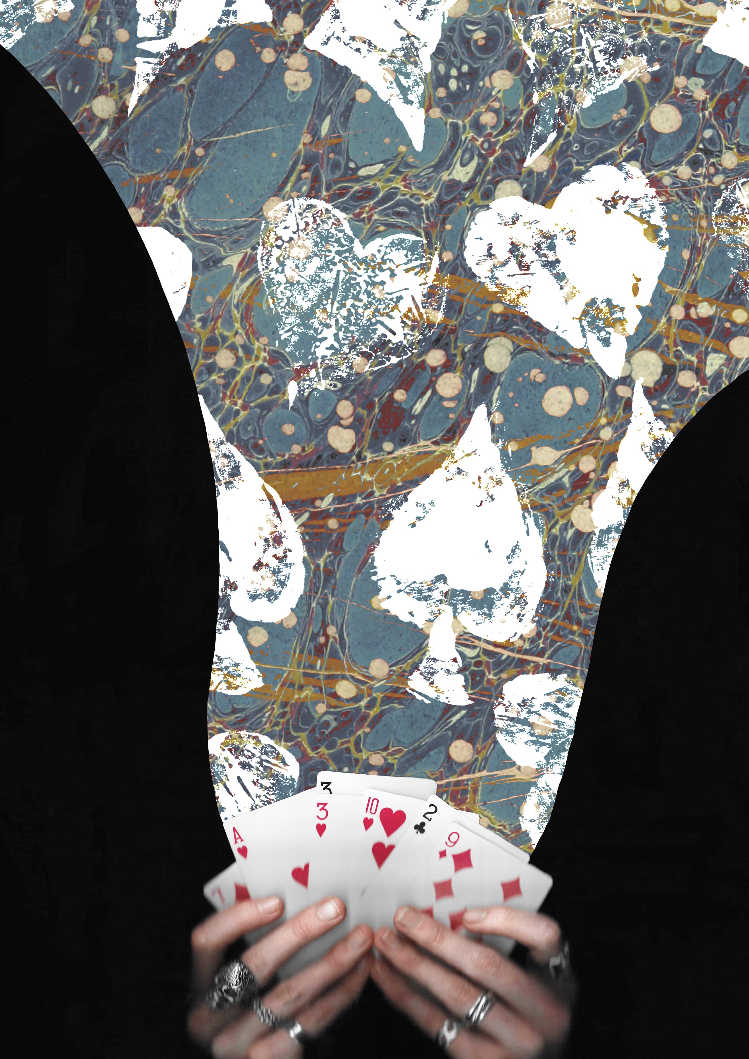 8. This is another collage using the scans I took of my hands holding some cards. This one also has a fantasy, playful concept with the cards moving out of the deck in a dynamic way. I really like this ideas and think it could work really well with an animated events of the 3 warped cards moving.