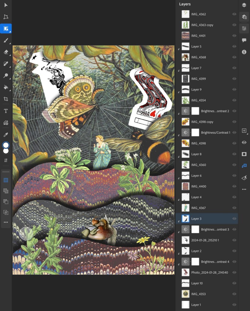 2. This collage was created solely with images I took from Flickr. I really wanted to use these as I love this traditional illustration style and think it works really well in a digital collage. The difficulty of the image was cutting out the complex shapes cleanly. To do this I had to use a range of selection tools including the lasso, object selection and quick selection tool to remove the backgrounds. This was a time consuming process but it was worth the time to achieve the detail and precision. For the style and composition I took inspiration from Michelle Thompson, who I mentioned in my artist research.