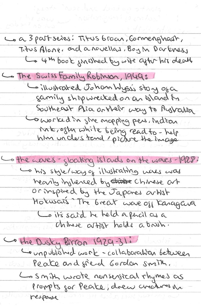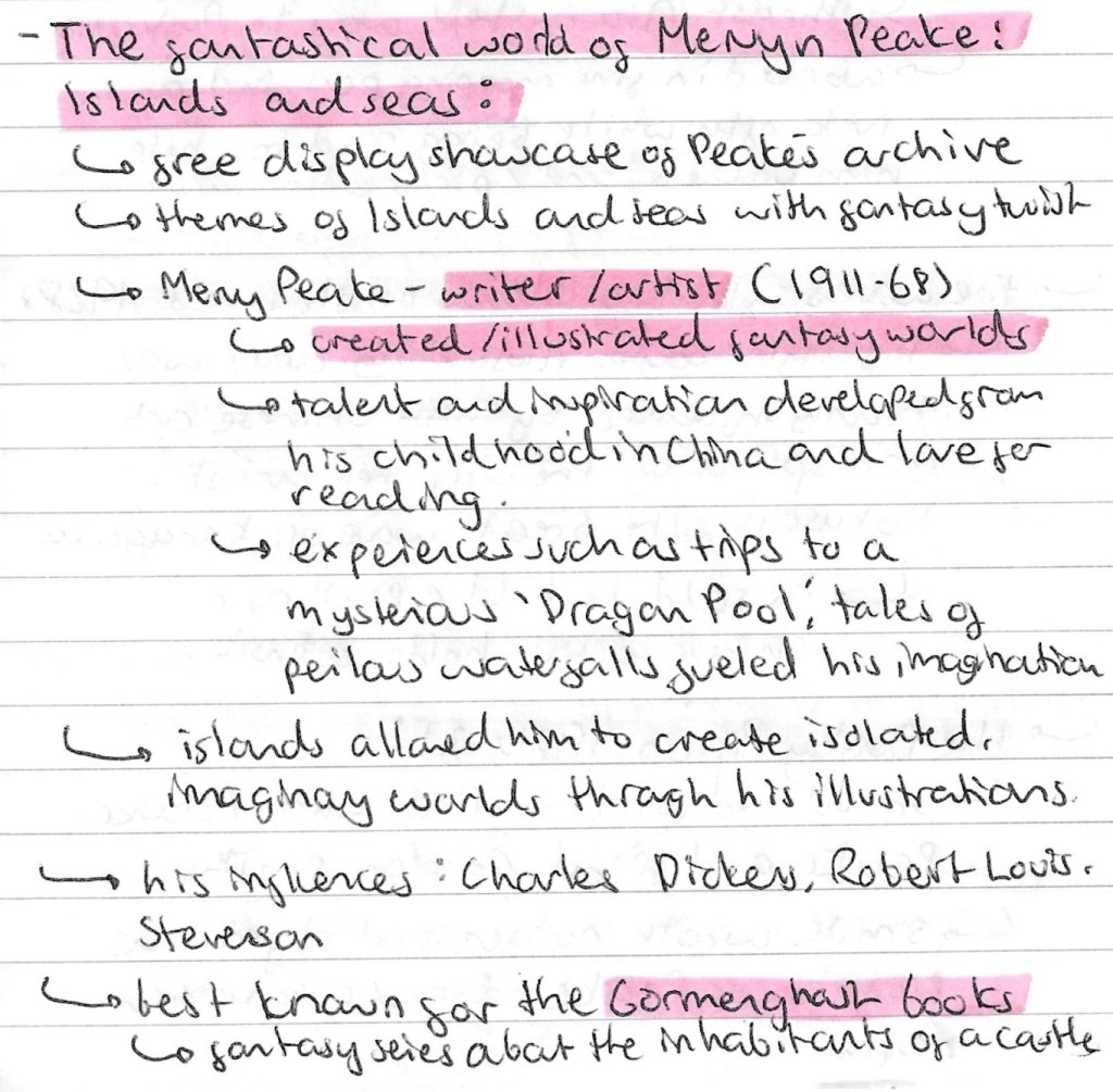 We visited the British library as a chance for us to engage with, critically respond to and document wider contexts of visual research. I went to the Malorie Blackman and Mervyn Peake exhibitions, 2 people who I didn’t previously know of. Below are some notes about the different choices of galleries we could visit: