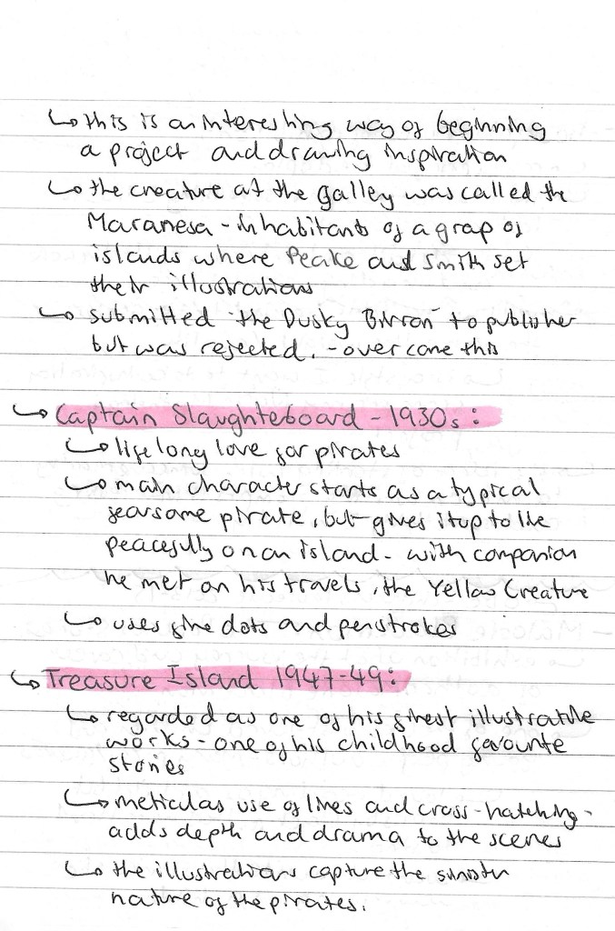Reflection: I really enjoyed learning about another illustrator and getting to see some work from his archive. I like his illustrative style and the fine quality of the line work and shading. This is a style I would like to experiment with and bring into my own project. His Treasure Island project is my favourite of his work as he uses lots of intricate hatching to build up the details and depth. Also Peake said that he would often illustrate a text as someone was reading it to him. This is a similar approach to what we did in one of the workshops and could be an interesting way of trying to illustrate the Norse myths.
