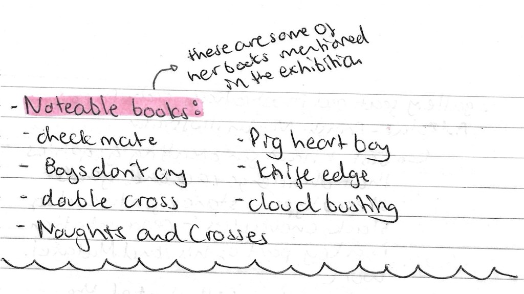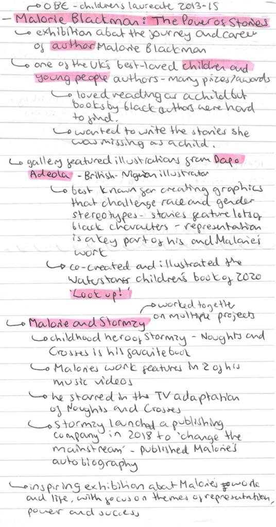 Malorie Blackman: The Power of Stories: this was an exhibition all about the life and work of Malorie Blackman who is a British writer who was Children’s Laureate from 2013 to 2015. She primarily writes literature and television dramas for children and young adults. A common theme in her work is using sci fi to explore social and ethical issues. For example ‘Noughts and Crosses’ is a fictional adaptation of Britain that she uses to explore the theme of racism.
