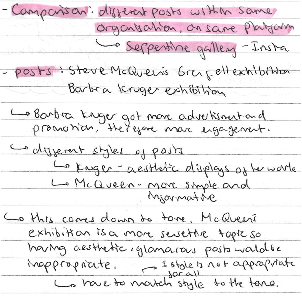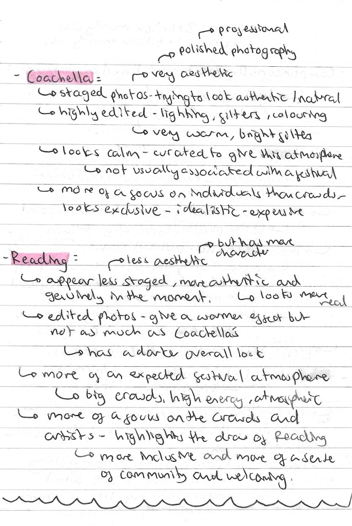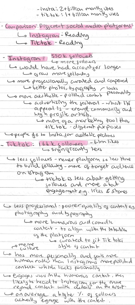 In the last couple of sessions we looked at static and sequential imagery and how to add actions and sound to a sequence. This week’s session was focused on action and interaction, by looking and different events on social media. It’s all about the companies creating something to get the consumer to interact. We looked at several types of comparisons, different events from similar categories, different social media platforms, different areas and different posts from same organisation. We looked at TikTok and Instagram as our social media platforms. Some of the organisations we researched were Coachella, Reading, Glastonbury and the Serpentine Gallery. This is relevant to our project as one of the outcomes we need to produce is a social media video, for Instagram or TikTok, so this is the type of research that we’ll need to do related to our industry/ event type. Below are all my notes that I made during the session and in my independent research: