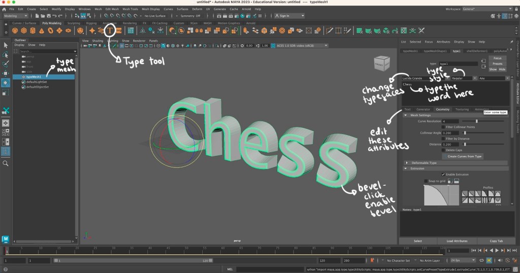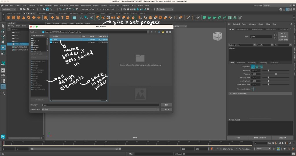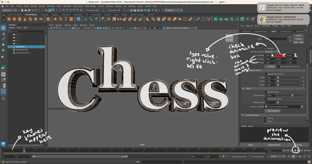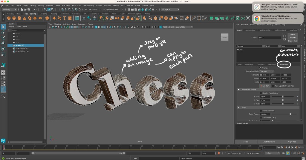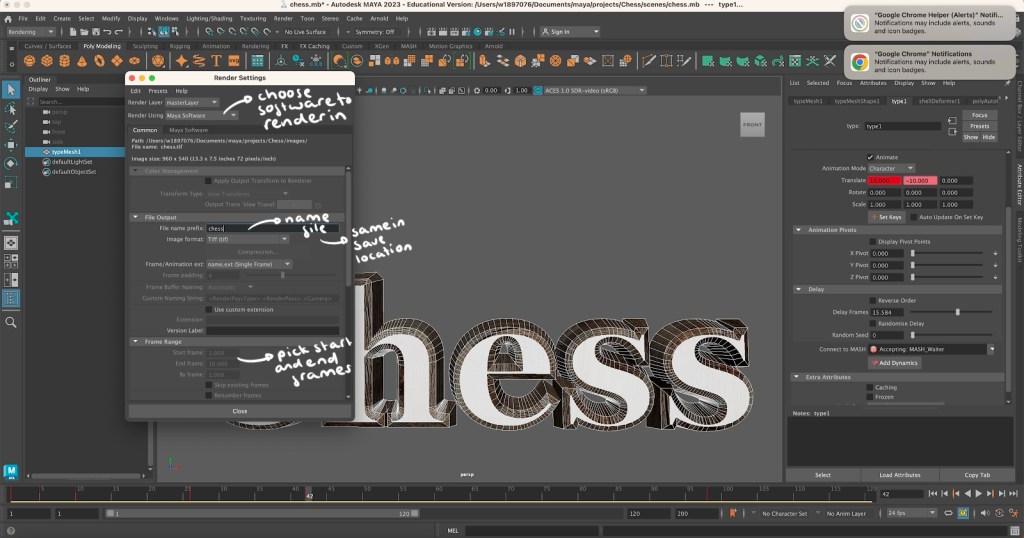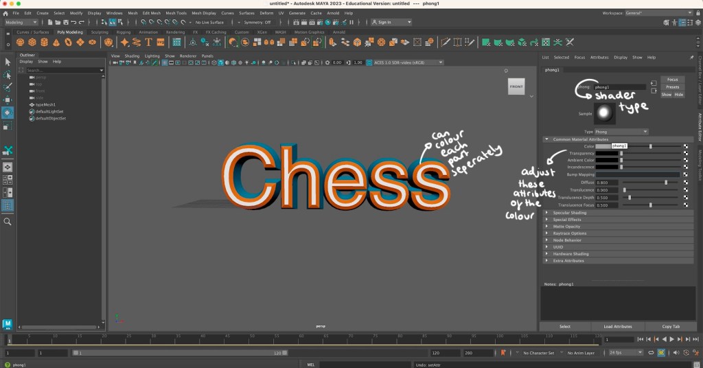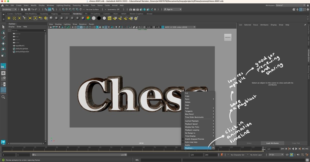 Maya animation: using Maya I was able to create and animate the word ‘Chess’, this is the topic I will be exploring in my project. I learnt how to add text and adjust its characteristic such as size and font. Then I changed the colour, added a shader and a bevel to make the word look more interesting. My favourite part was learning how to download and add textures to certain parts of the word. I chose a wooden texture which I put on all parts of the letter except the front. This gave the letters a clean white and dark brown wooden colour combination which are the colours of my chess board. The hard part was animating the word. I did find this difficult but I am happy with what I was able to create. The letters jump up one at a time with a delay in between then smoothly fall down. Below is the exported video of my animation:
