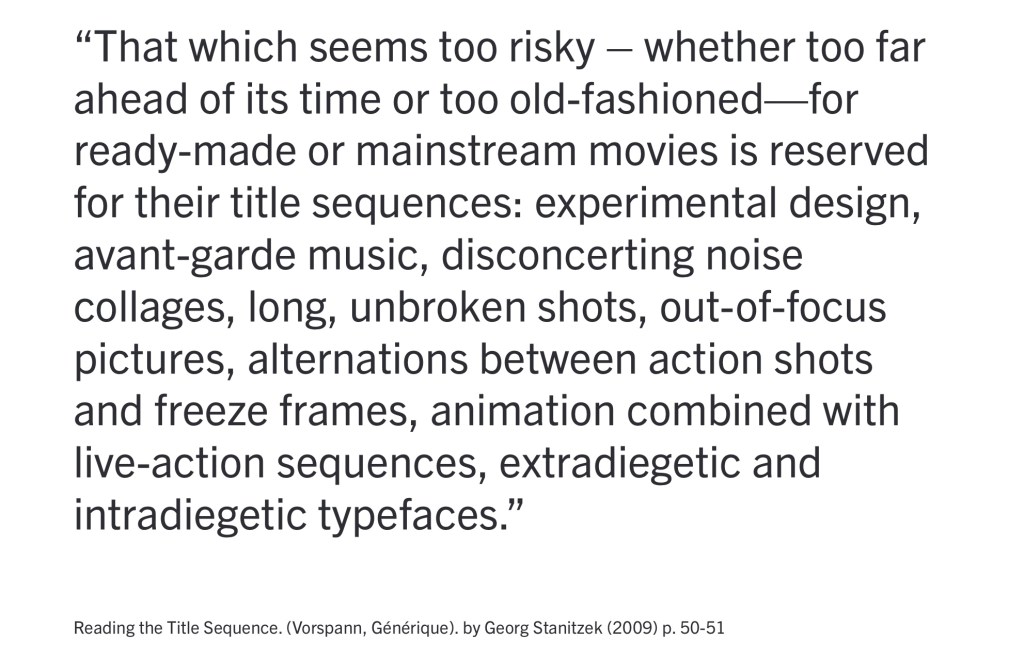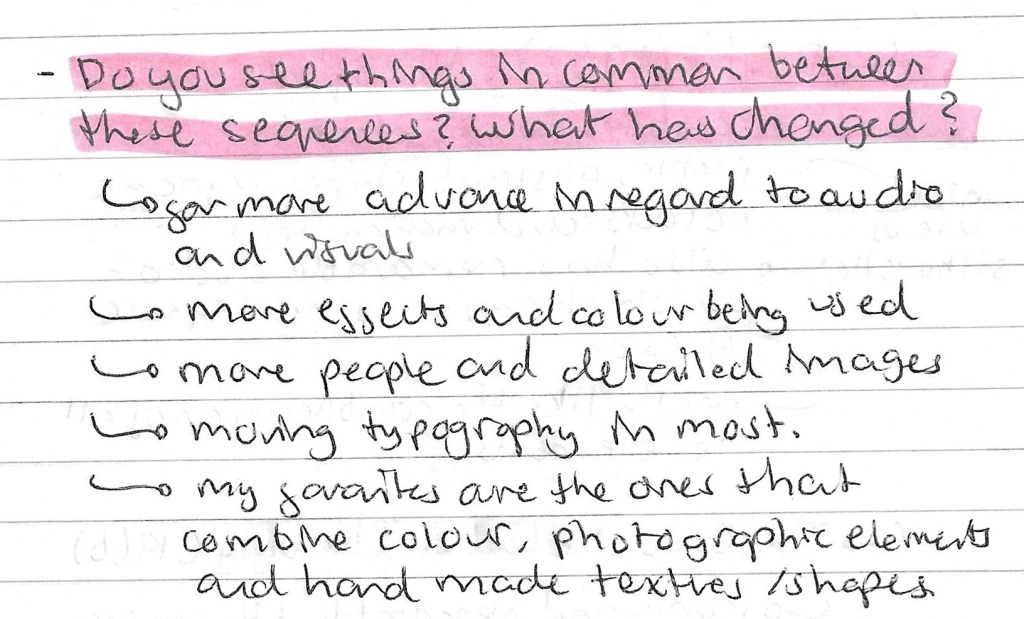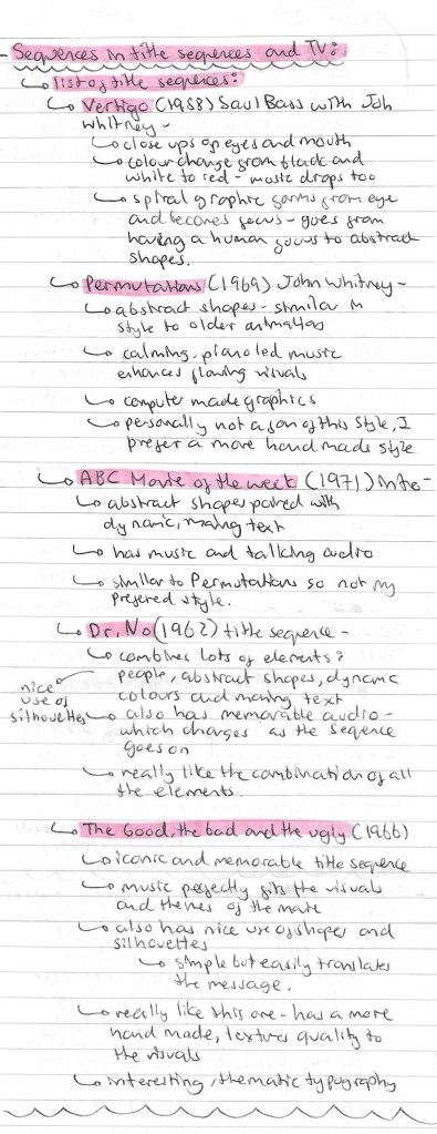 Title sequences: another activity we had was looking at the visual identity of different title sequences. We looked at 5 different title sequences from the 1900s. Below are the notes I made about each sequences: