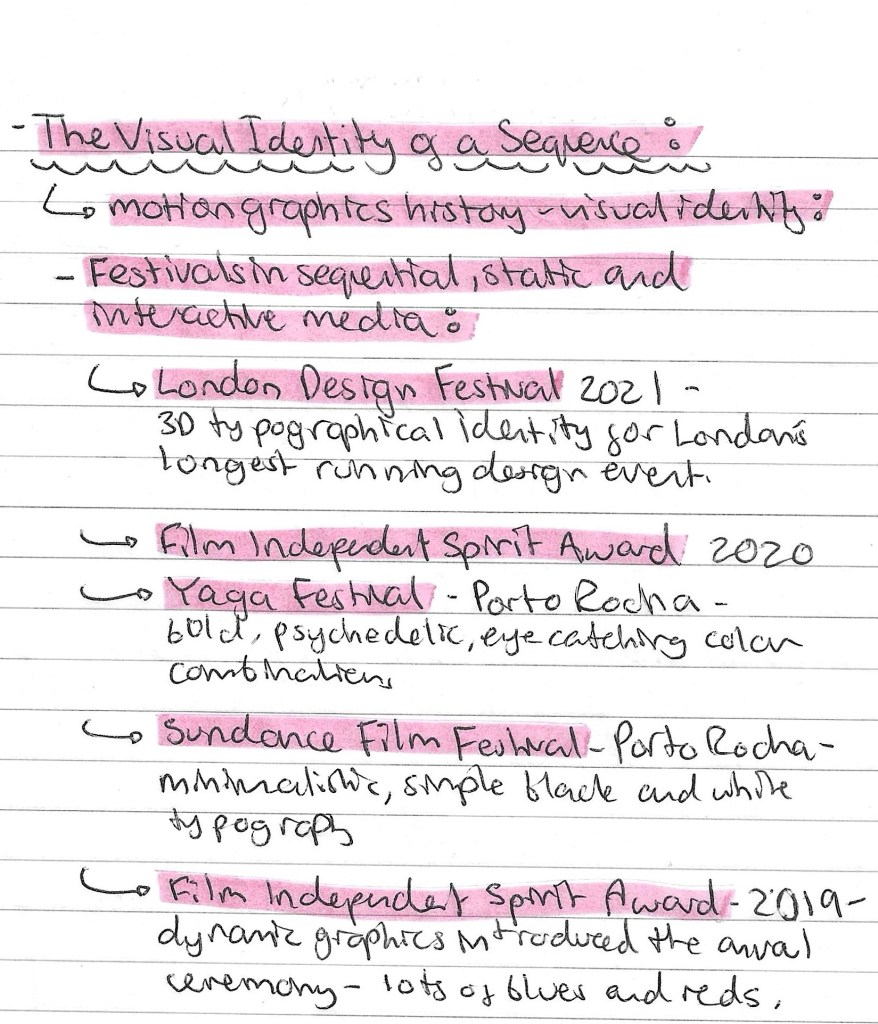 Reflections: this session was helpful as it taught me a lot about the importance of creating a unique and recognisable visual identity. This is key to this project as all 3 of the outcomes will needed to have the same visual language in terms of colour, aesthetic, imagery and typography. We looked at design festivals, abstract films and title sequences, giving me a broad range of research to take ideas from. As well as learning about the importance of a visual identity I started to think more about what sort of styles I’d like my project to have, these are ideas I’ll be developing over the coming weeks.