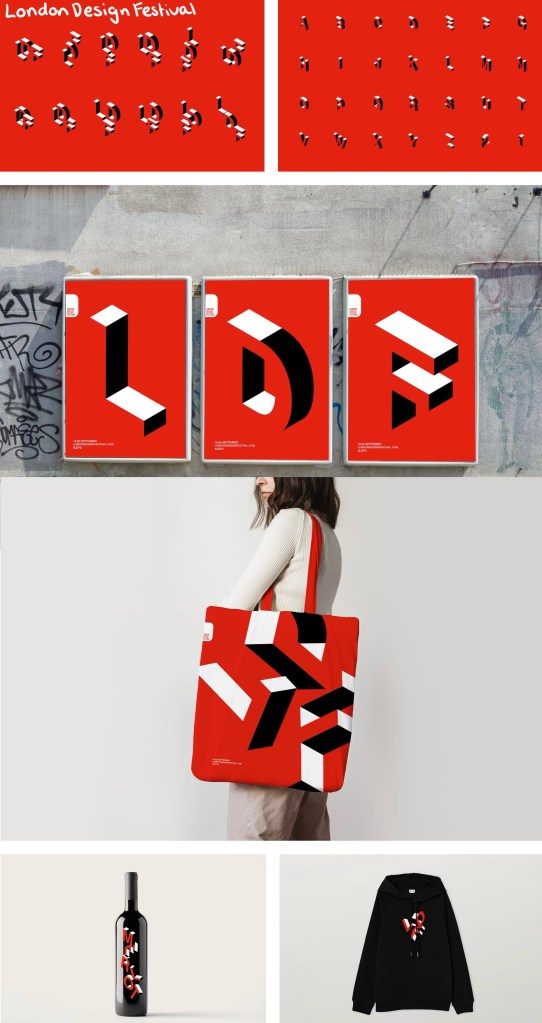 London Design Festival: this is London’s longest running design festival and below is its visual identity from 2021. It has a very simple colour palette of just 3 colours, black, white and red. The red is a bold colours so immediately draws people’s attention and it’s strongly connected to London. I like the 3D typographic style, it’s unique and interesting enough that it can carry a poster with just the typography. This simple combination of colour and typography is enough to be the visual identity and this can be seen across advertising and a variety of merchandise.