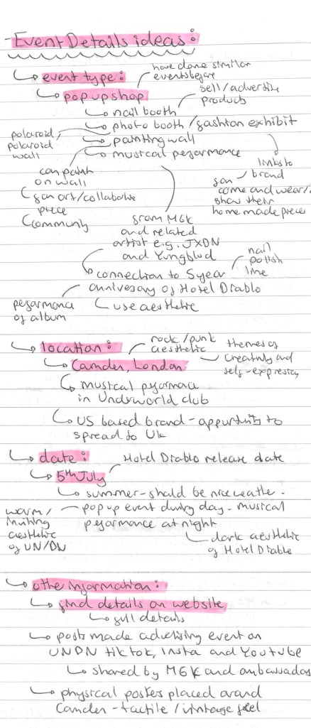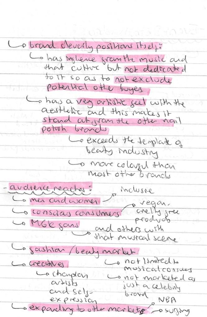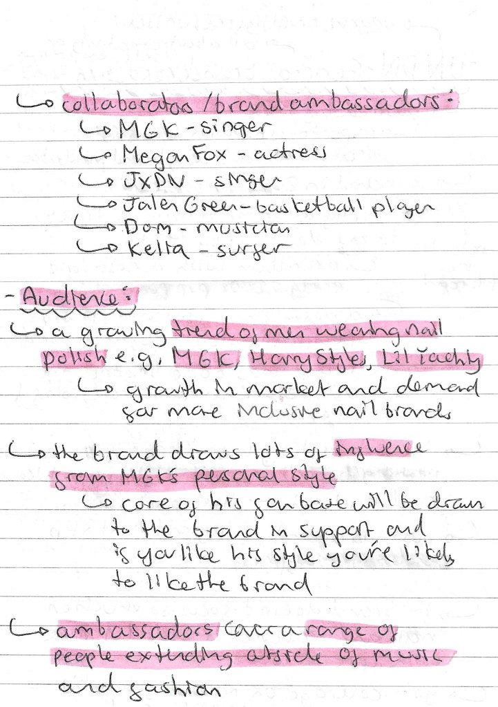 Audience: an important area of research for this project is to look at the audience for the brand and event. This is key as I will need to target all my advertising to this audience so I need to understand who they are and what they will like. The brand has a clear aesthetic and visual identity but cleverly positions itself in the market to attract attention and interest from a wide ranging audience. A simple way they do this is by having brand collaborators and ambassadors for different demographics and industries. Another way they they wider their potential consumer base is by clearly stating that it’s a unisex nail polish brand. Most nail polish companies target their products to women, excluding a potential male audience. There’s a growing trend of men wearing nail polish so this progressive move is clever from the brands perspective. This dude ranging audience means I have lots of creative freedom in my project. More details on their audience are below: