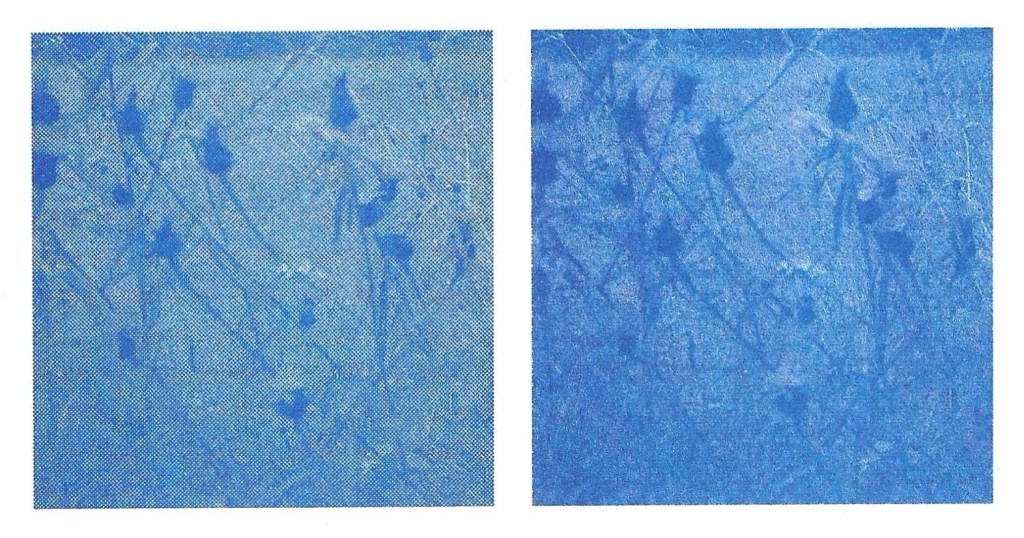 Printing texture: Riso printing can achieve 2 different textures, halftone/gain touch (left) or screen covered (right). The specific settings of these can be adjusted to achieve different looks. In my printing I’d like to experiment with both textures. Below is a comparison of the 2 types: