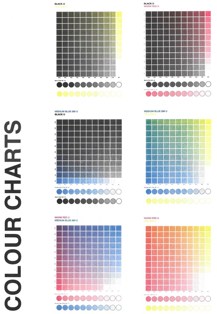 Colour charts: the university has a limited selection of colours to use for Riso printing. The options are black, red, blue and yellow. I will experiment with using different combinations of these colours for my printing. Below are all the different colours that you can achieve by using combinations of the 4 available colours: