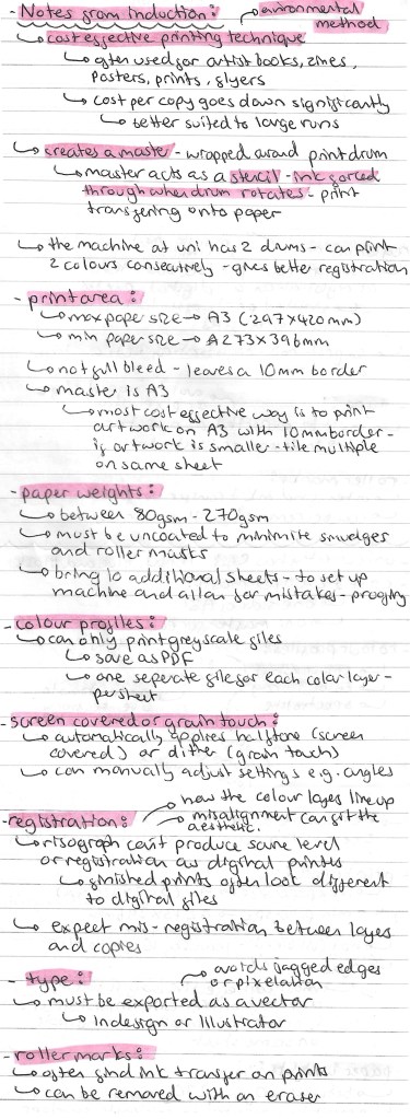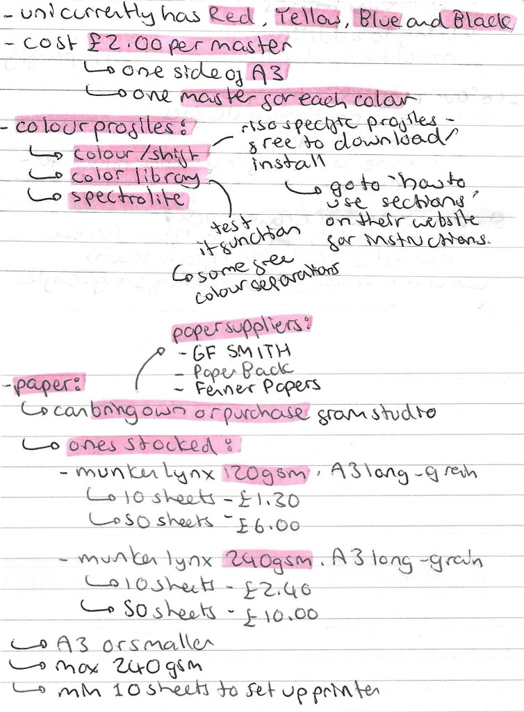 Notes from induction: including information on costs, creating a master, printing size, paper weight, colour profiles, texture and registration: