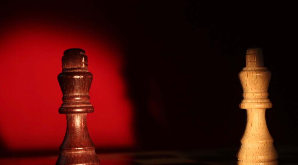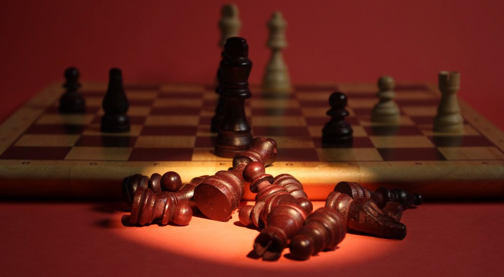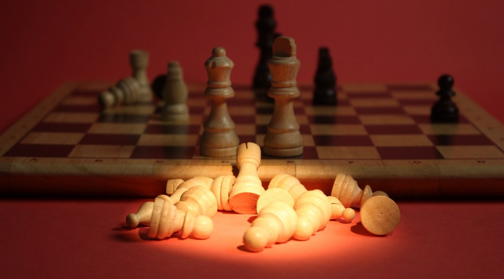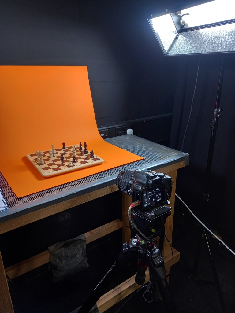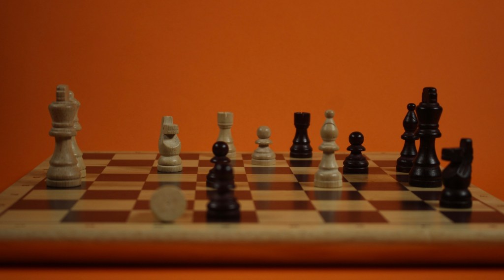 Scene 2: Battle: I wanted to have a big contrast between scenes 1 and 2 to get across a dramatic increase in intensity. The game has gone on and in scene 2 you see several pieces get knocked over. When shooting the sequence I made sure to adjust the focus to the area of the board that the battle was happening so that in editing I can zoom into that area and it won’t look blurry. This scene is also in 24 frames per second but during the editing I may slow down the pieces falling for dramatic effect. The way I made the pieces fall was using blue tack and slowly moving them down. This worked well, the only issue being that at some points it was visible which is something I’ll need to hide with editing and effects. I shot this scene at a lower angle, with dimmer lighting and an intense orange background. These changes make the scene feel more intense.