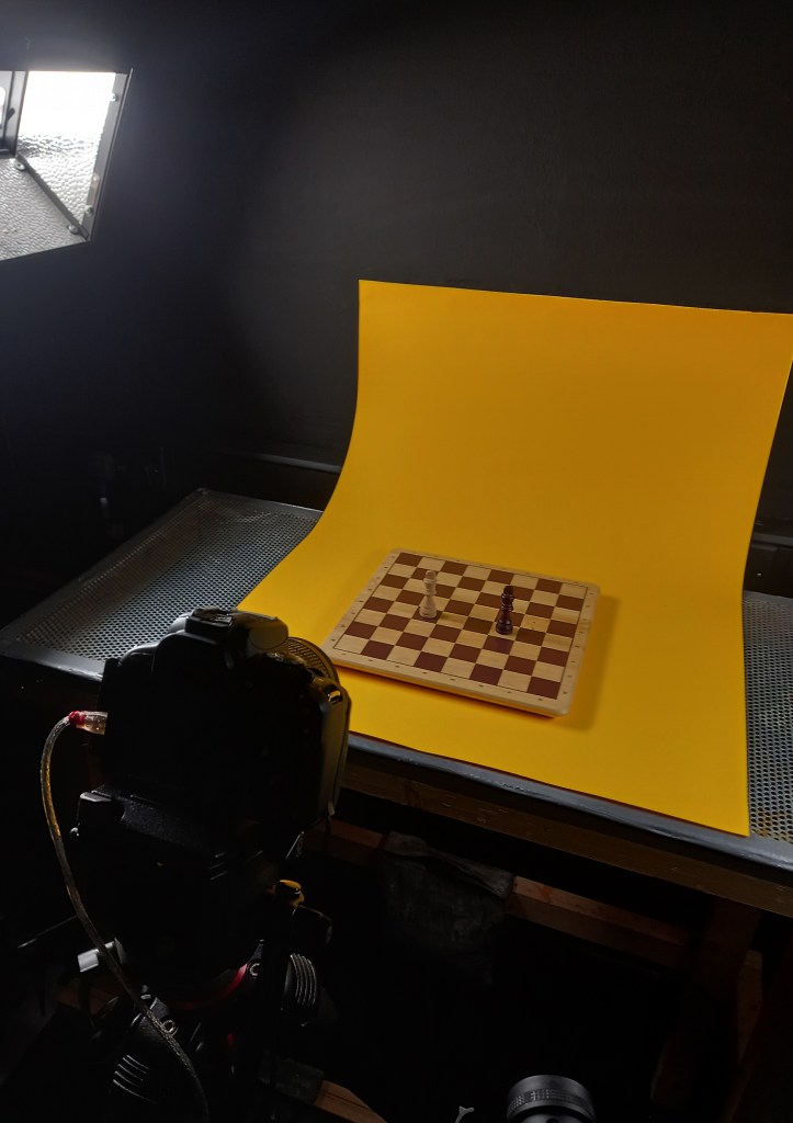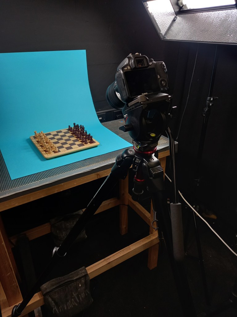 Scene 1: Game begins: The opening scene show the start of the game , where pieces begin to move at a steady speed, shot in 24 frames per second. For scene 1 I chose to have simple, balanced lighting coming from the 2 studio lights. I chose the background to be blue so it’s a cool, calm colour so that the video starts at a low intensity. The camera angle is from slightly above to get a good view of the whole board. I had to reshoot this scene a few times as I initially struggled to get the movements smooth. I was able to achieve the smooth movement I wanted by moving the pieces at smaller increments.