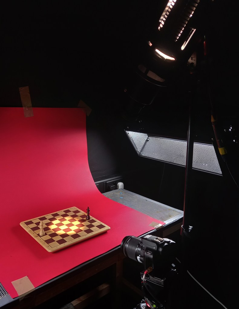 Scene 6 and 7: Intense shadows: scenes 6 and 7 are increased intensity face offs. I chose to make these fast paced scenes so there wasn’t too much of the video focused solely around the face off between the kings. I didn’t plan these scenes, they were improvised on the day. The ended up being some of my favourite shots due to the cinematic lighting and shadows. To achieve this I completely turned off the studio lights so all the light came from the dedo which allowed for these nice shadows to be cast on the bright red background. The movement of this scene is interesting as it’s the only scene that the pieces are stationary, it is the board that I moved to create this sense that the camera is rotating around the board.