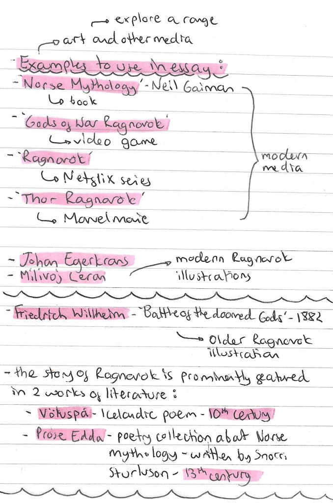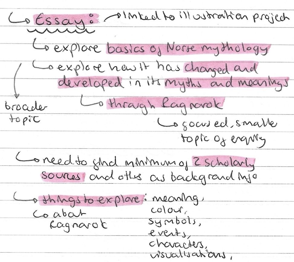 Earlier in the semester I made a list of potential essay questions linked in Norse Mythology and from this I narrowed down the topic I wanted to write about. I haven’t got an exact title as of yet but I decided I want to base it around how Norse Mythology has changed and developed over time. As it’s only a 2000 word essay I had to narrow down the topic of enquiry so I have chosen to centre it around Ragnarok. This is one of the most well known and interesting Norse myths so there are lots of sources to look at and reference. In the illustration project I’m creating an illustration of Ragnarok so it goes hand in hand with this. Through the research I’ll do for the essay I’ll be able to create a more interesting depiction of Ragnarok.