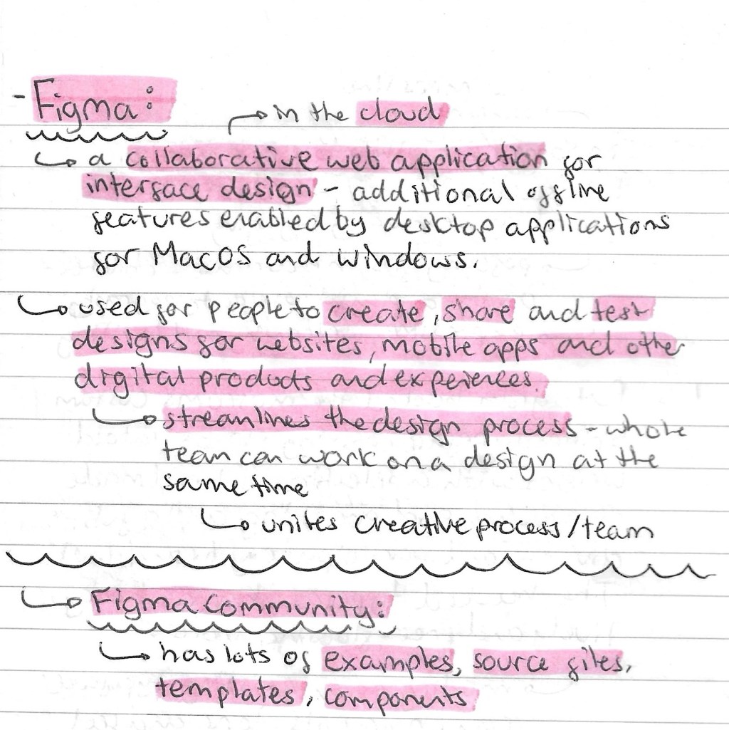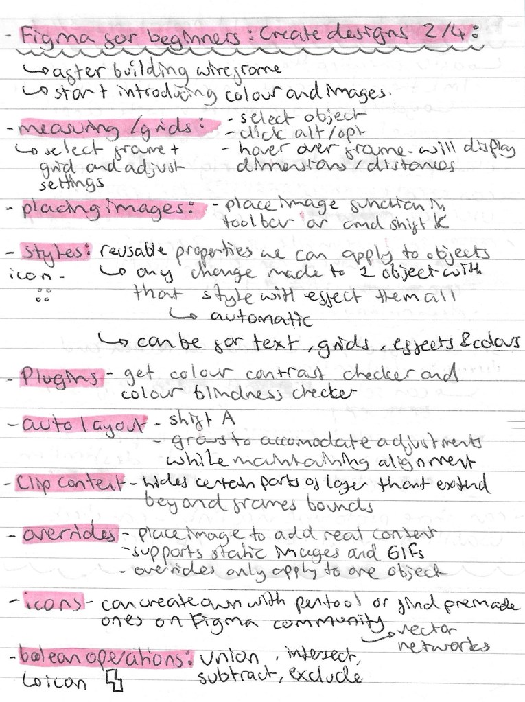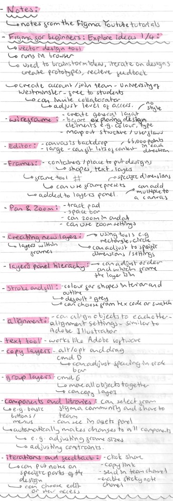 Note from videos: our introduction in the lesson was very brief so I watched a series of introductory tutorials from Figma’s YouTube channel to advance my knowledge and confidence with the application. I learnt a lot from these videos, all the notes I made from them are below: