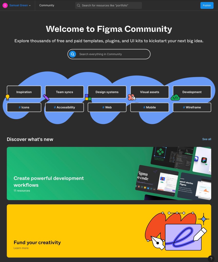 Figma community: this is an additional website that has lots of inspiration, examples, templates, visual assets and more than anyone with a Figma account can use.