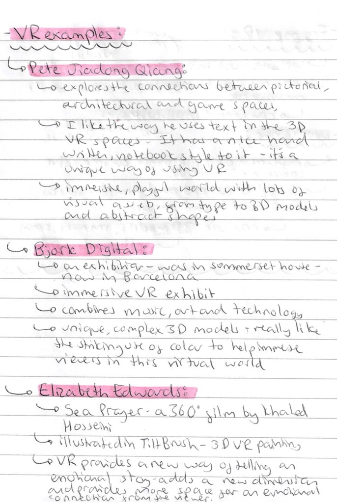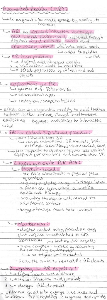 Reflection: I really enjoyed this workshop learning about 2 different types of immersive arts, AR and VR. I liked having a break from working on my chess project and engage with the theme of play in a different way by using otters as my topic. I had very little knowledge or experience with immersive arts so I was able to take a lot from the session. I found both activities fairly straight forward in regard to using the websites. I’m happy with the outcomes I created, I think they’re fun, playful and where a good introduction to the technology we were learning about. Out of AR and VR I definitely prefer AR as it is a way to advance my more traditional and usual style of art whereas VR is completely isolated from that. I won’t be using this technology in my project but it is something I’d like to explore more in the future.