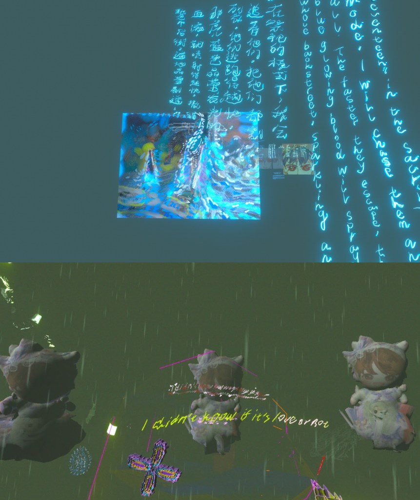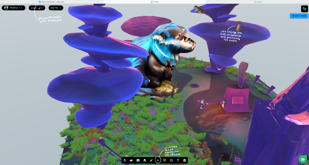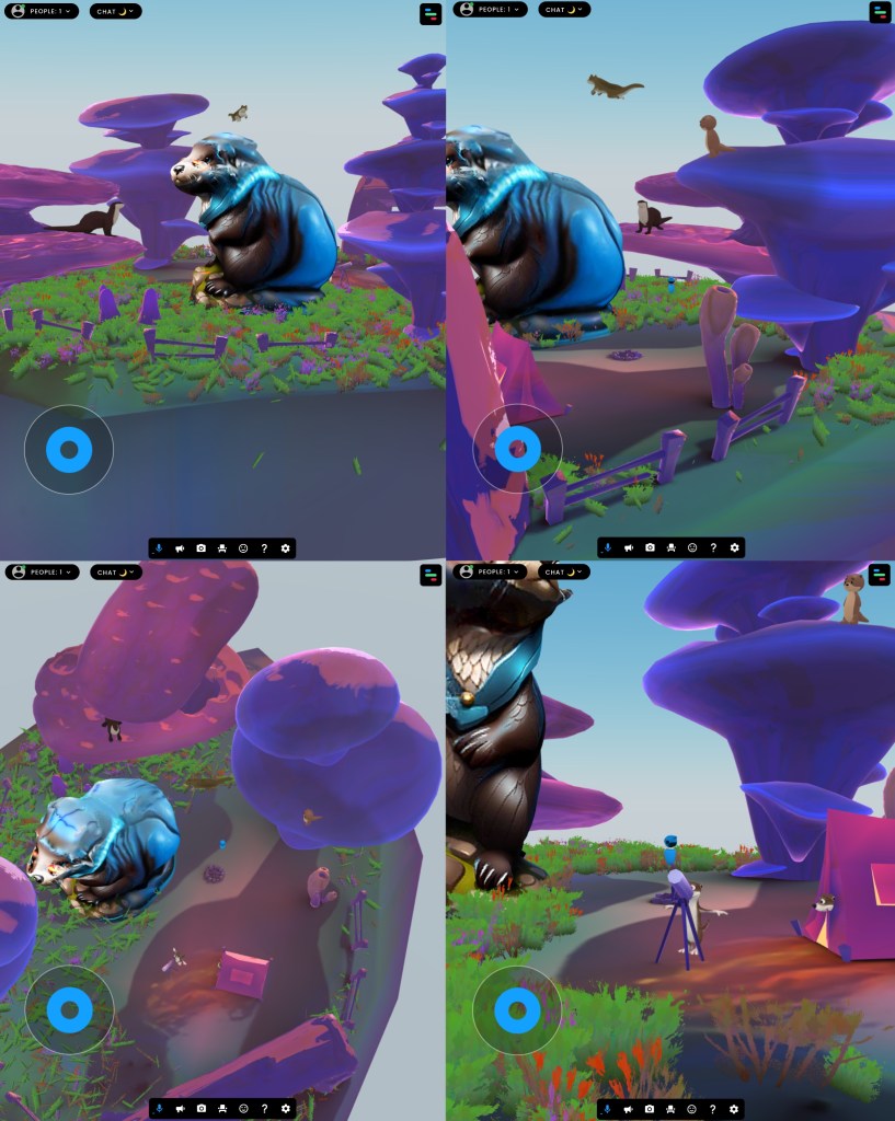 The Otterverse: I chose to continue with the otter theme for the VR exercise. The website was relatively simple to navigate and use. I first chose which base world I wanted, I chose this one as it was the most colourful and fun which was the time I wanted to go for. Then I began downloaded free 3d models from Sketch Fab and importing them into this world. I populated the world with around 8 otters, each one slightly different. Within the scene I wanted to create little narratives such as the otter peeking out of the tent and the flying otter. This makes it more playful and fun to explore round and try find these different things. It was a good introduction into creating a fully digital, immersive world that people can explore.