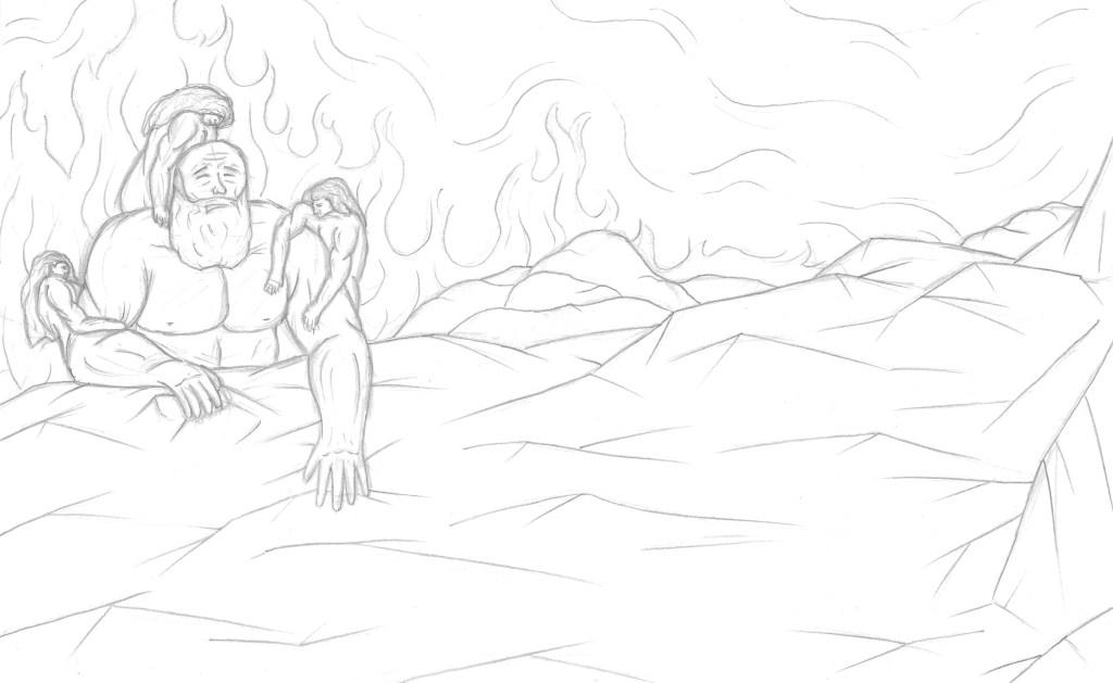The Creation of the Cosmos: I didn’t make any major changes to this illustrations, except making the image slightly longer and thinner. Other than that I just improved on the sketch, adding in more details to the characters, fire and ice.