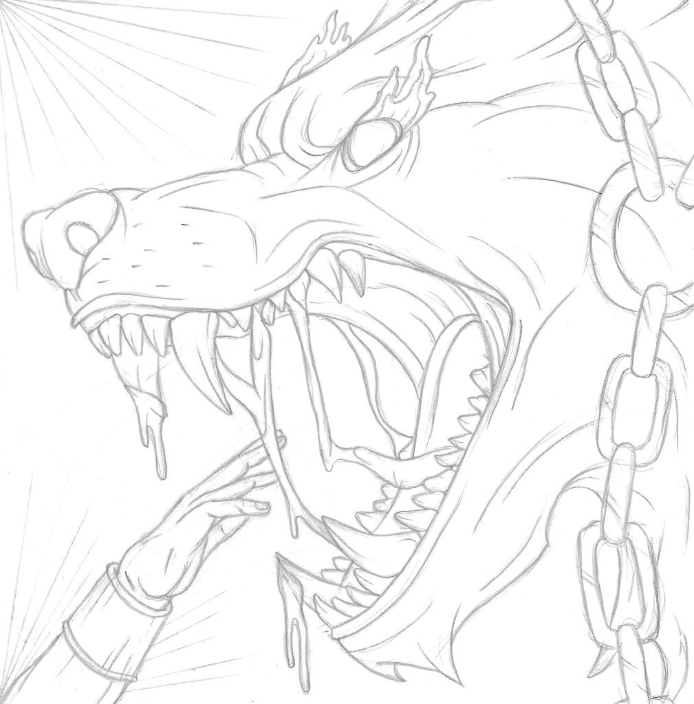 The binding of Fenrir: No drastic changes were made to the concept or composition, I just improved on the drawings of the hand and Fenrir. For the hand I used a photo of my own hand for reference, making sure that it was very small in comparison to Fenrir’s mouth to emphasised the imbalance of power/strength. To draw Fenrir I used reference photos of wolves to help me get the proportions are forms right. I’m really happy with the sketch and this it improved significantly from the original one with the most important detail being the increase in size of Fenrir’s mouth.