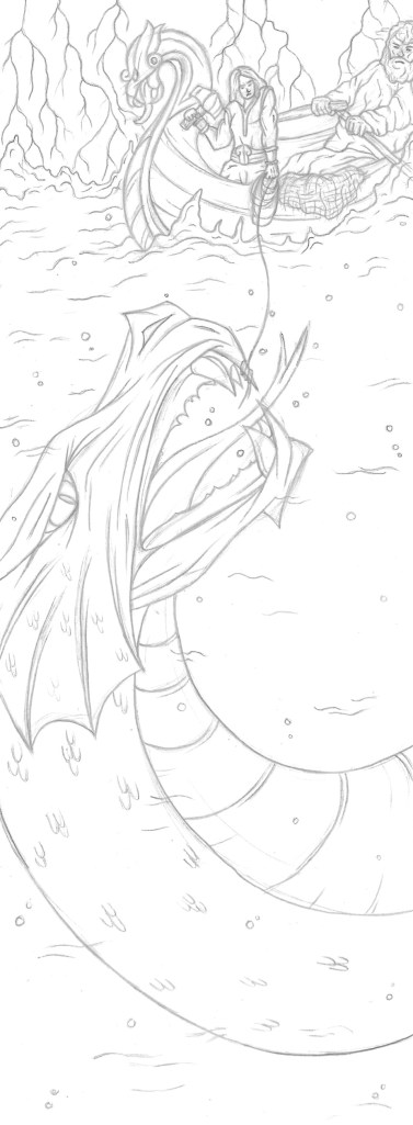 Thor fishing Jormungandr: the concept of the image remained the same but I did make a couple of key changes. One thing I removed was Jörmungandr wrapping around the ship as it didn’t flow nicely with the rest of the composition and took away from the sense that he was coming from the depths of the sea. Also I significantly extended the image, making it a lot longer and therefore appearing thinner too. This was to show more of Jörmungandr and really emphasise how monstrous he is. Other that than I just improved on the sketch, adding more details to the characters, boat, sea and sky.