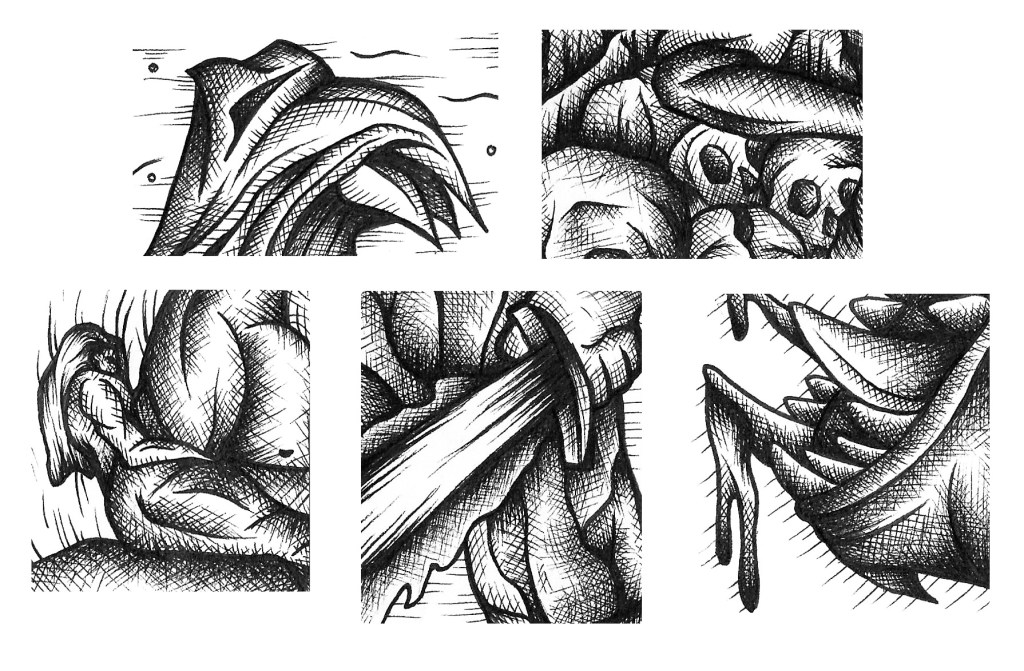 Hatching sections: one of the mediums I’m going to use for these illustrations is hatching and pen shading. I did some experiments with different styles of mark making and found that I like using straight line hatching for shading with a pen. Here is 1 section from each image that I did completely in this style: