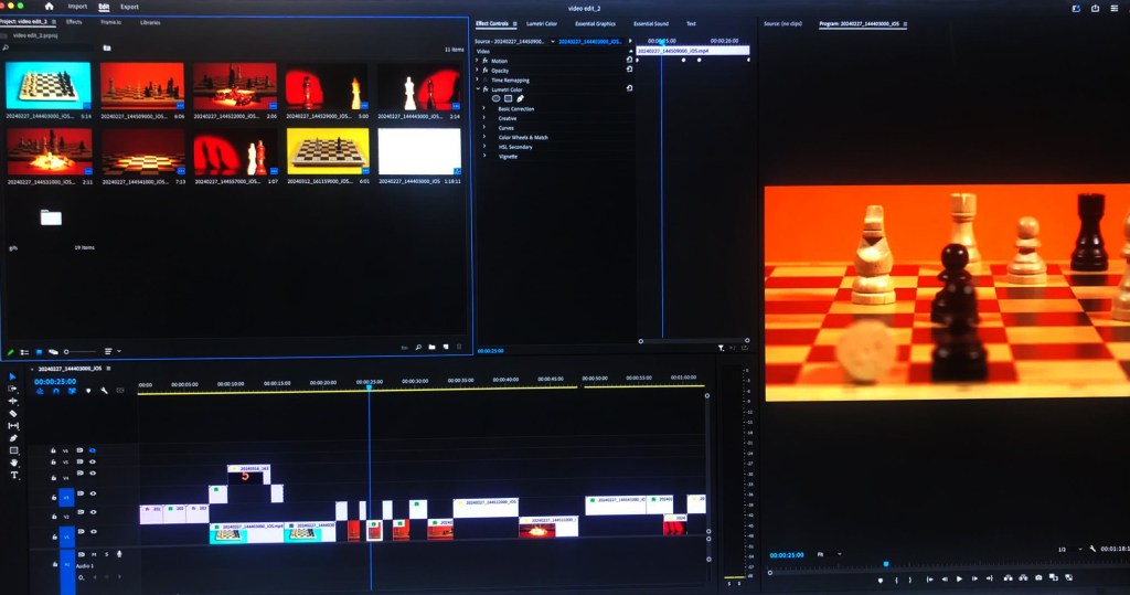 What we did on Premier was import all of the chess stop motion sequences and the GIFs of the 2D paper cut out. With this we put them all in the right order, adjusted the speed and duration of each sequence, adding the transitions we wanted. We were able to make some of the shots more cinematic and intense by using zooms and framing techniques. We also did some colour correction to some of the shots to make them look more vibrant and intense. This is a photo of our work on Premiere:
