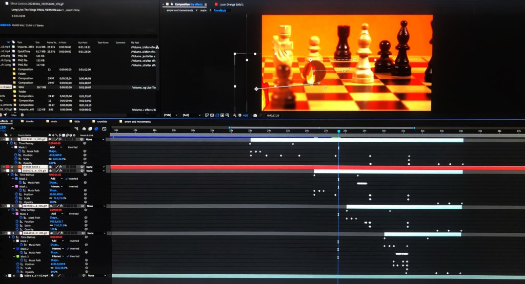 Thanks to having João join the project we were able to achieve more advanced and technical editing than I could have achieved on my own. I think particularly during our After Effects sessions we had a really good working relationship as we where able to continually develop on each others ideas which really helped us advance the editing beyond our original plans. On here we did lots of work with the title, outro sequence, fire, smoke and movement lines. One particular tool that I learnt a lot about was masking. In several sequences we drew and animated masks using key framing. The scene that has the editing I’m most proud of is scene 2, the battle scene. It has colour correction, zooms, fire, glow, movement lines and masking. Below is a photo of our work on After Effects: