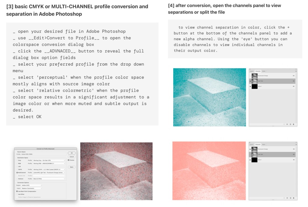 During the induction I learnt about a couple of different websites that can be use to create colour profiles for Riso printing. The one I used was Color/shift. Using this website you can download specific colour profiles and then add them to an image and it will automatically sepertea the colours. Below is the link to their website and a list of instructions on how to download and use different colour profiles: