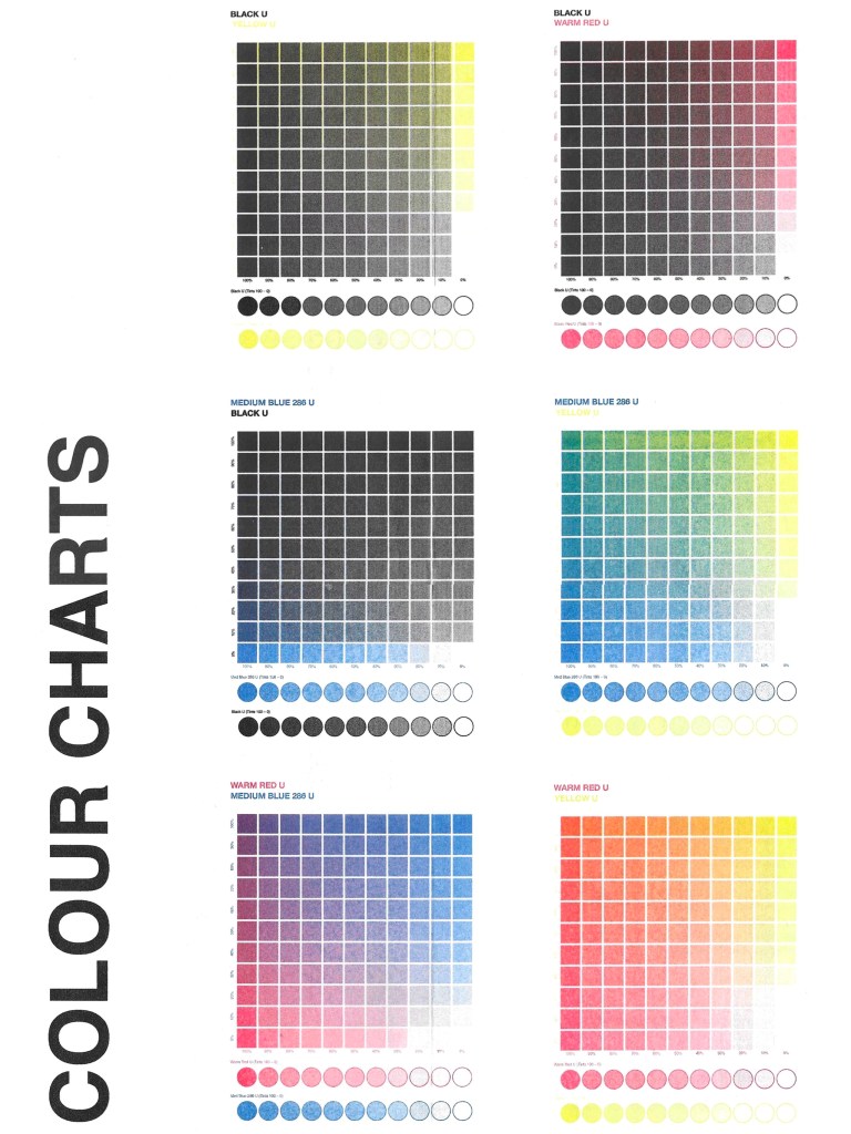 Colours available at University for Riso Printing: when picking what colour profiles to use it was important to keep this colour chart in mind as I will only be able to achieve these colours: