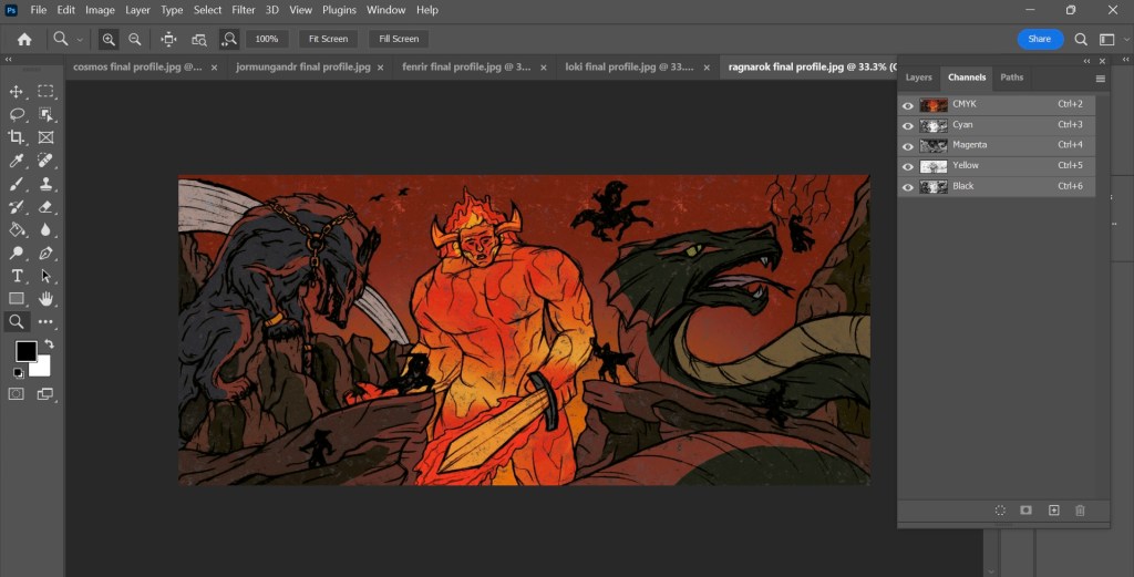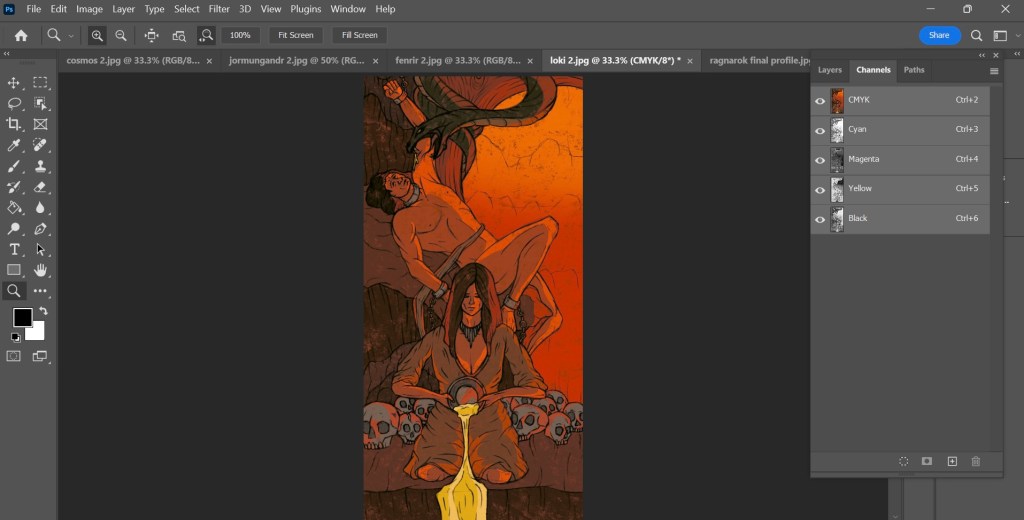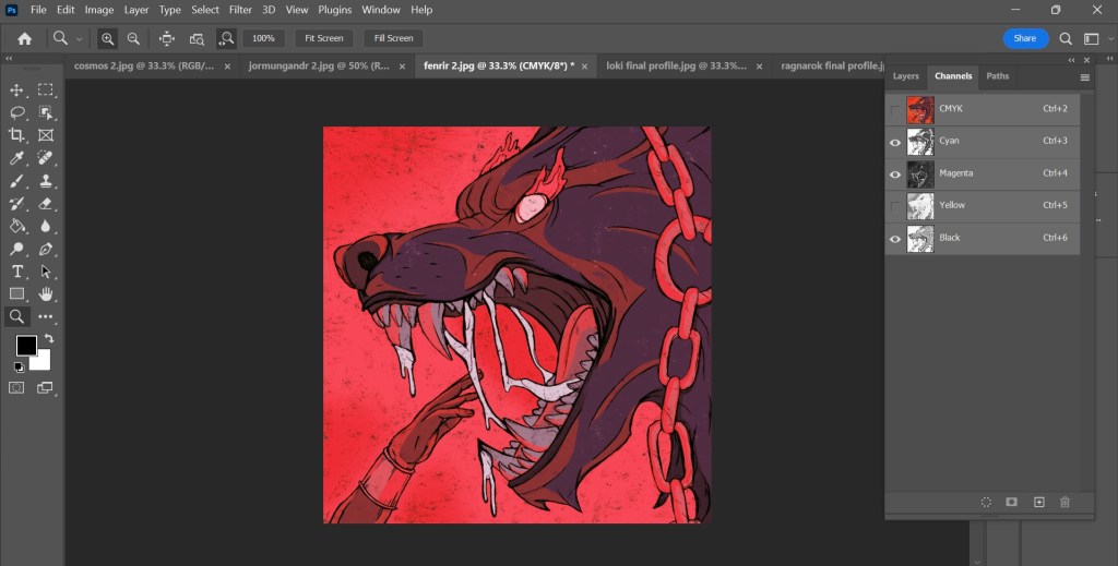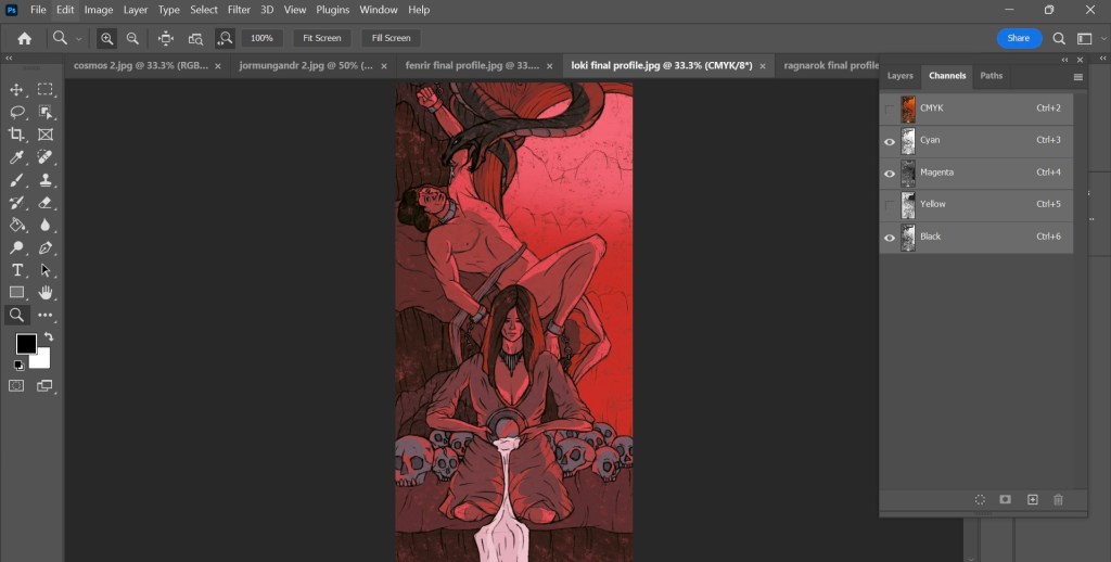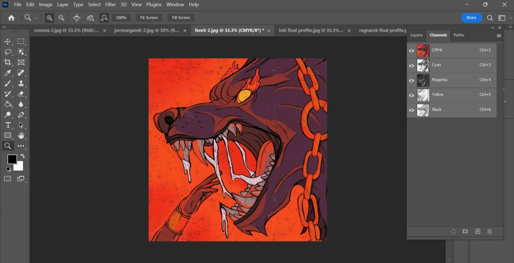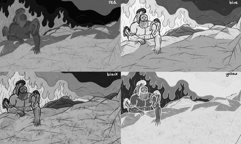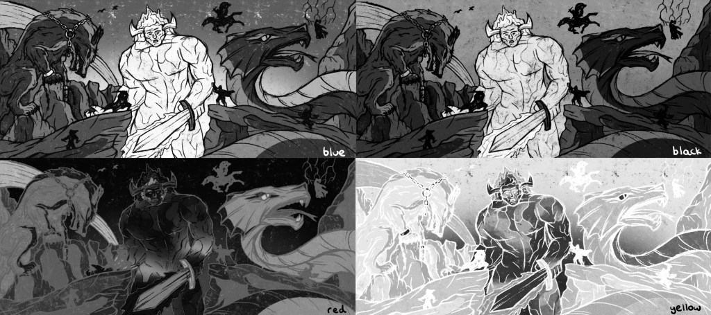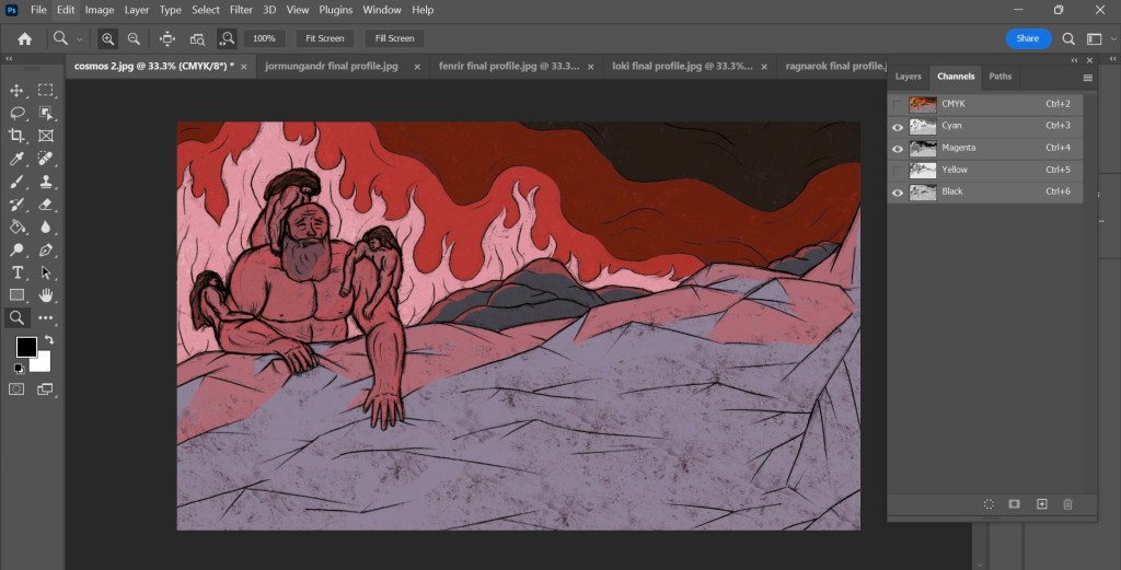 Now that I have my finalised colour illustrations I need to prepare the files for in the correct way for Riso printing. One important thing I did throughout the process of colouring the my images was to put each bit of colour on a different layer. This made adjusting the colour easier and will make creating the colour profiles easier.
