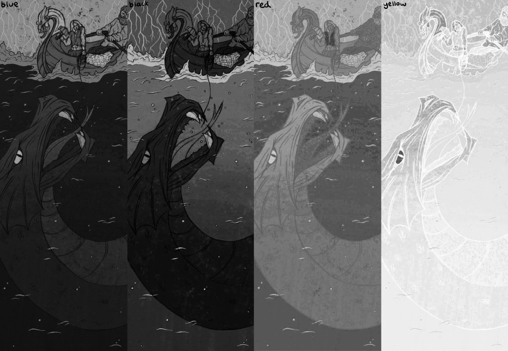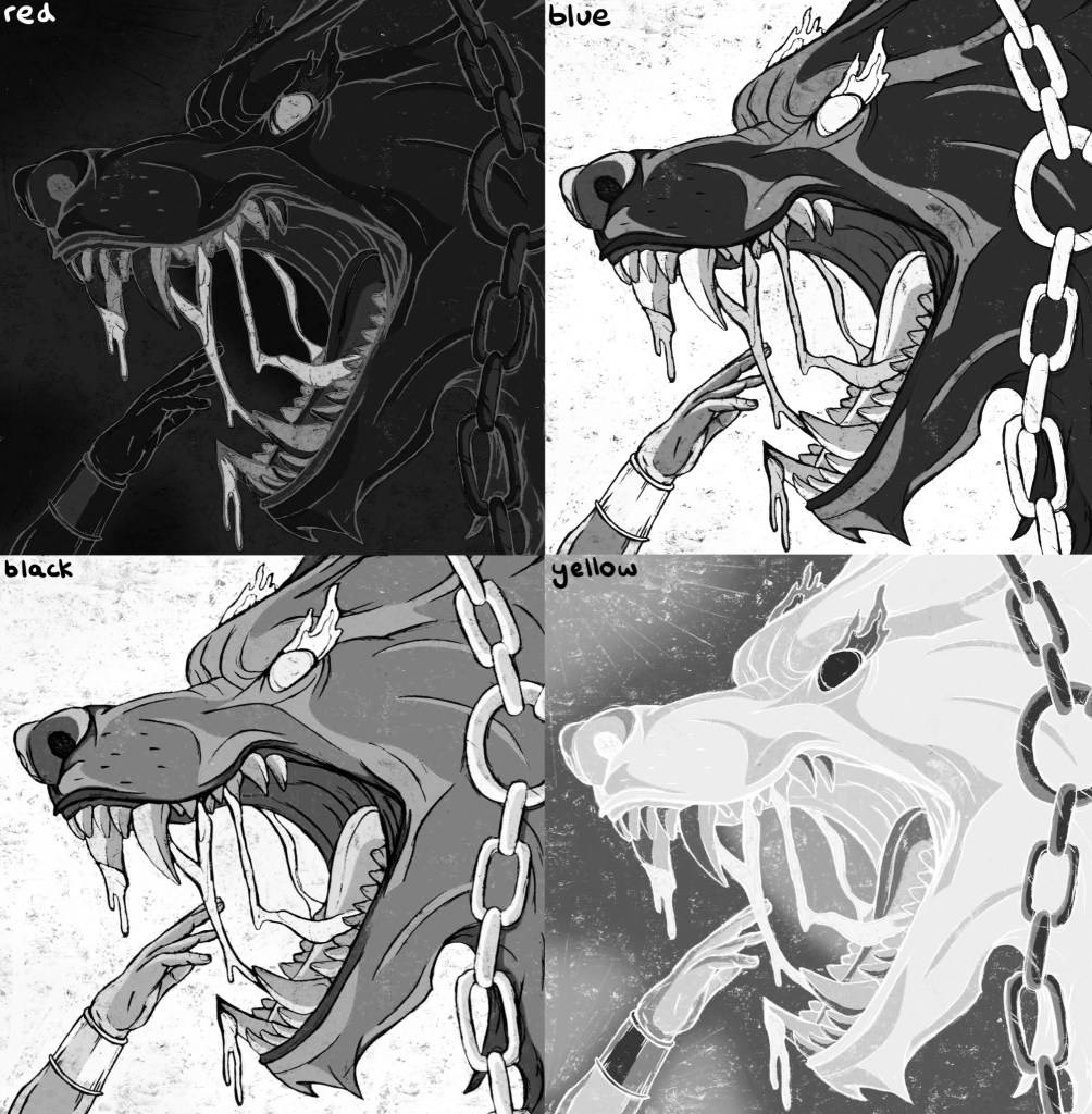 Colour Seperations: after applying the colour profile to my images and experimenting with different combination I separated each layer. When you separate them they automatically become greyscale as this is the format they need to be in for Riso printing. I then saved each separate colour profile as a PDF. Below are the 4 colour separations for each illustration that I can use for printing: