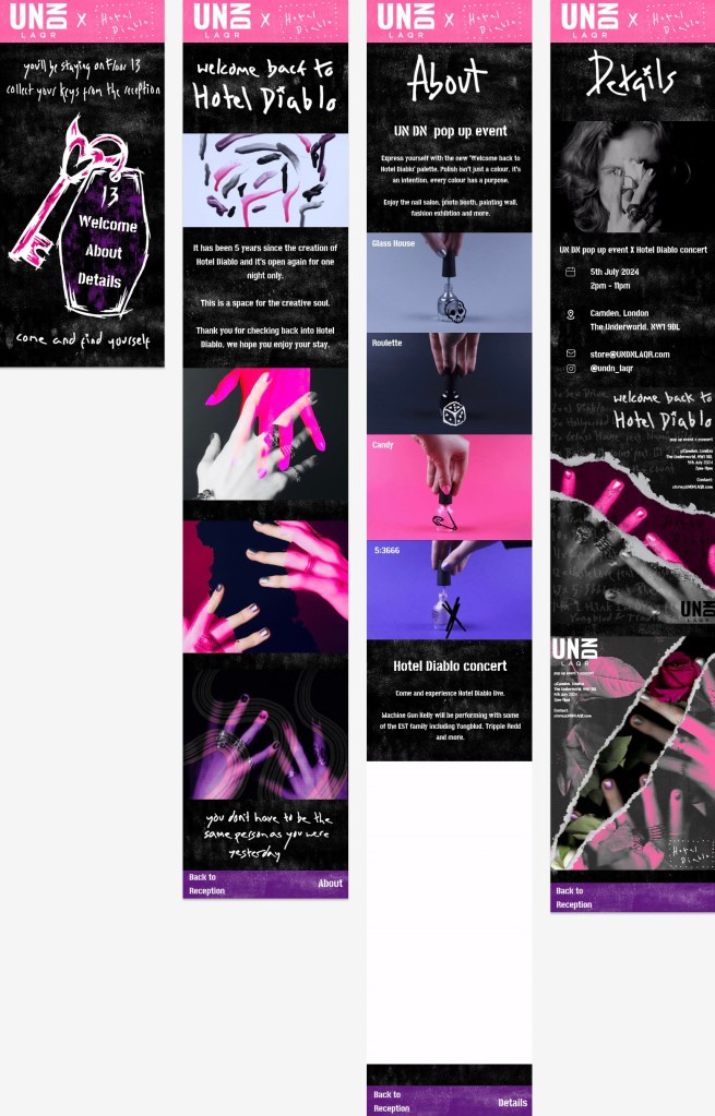 Welcome back to Hotel Diablo: this page is titled with the event name and introduced what the event is about. I chose the dripping nail polish GIF to be the first image they seen because it a unique and abstract image but also immediately gets across the product and colour palette. Then there are a series of edited images of hands showing the aesthetic of the event.