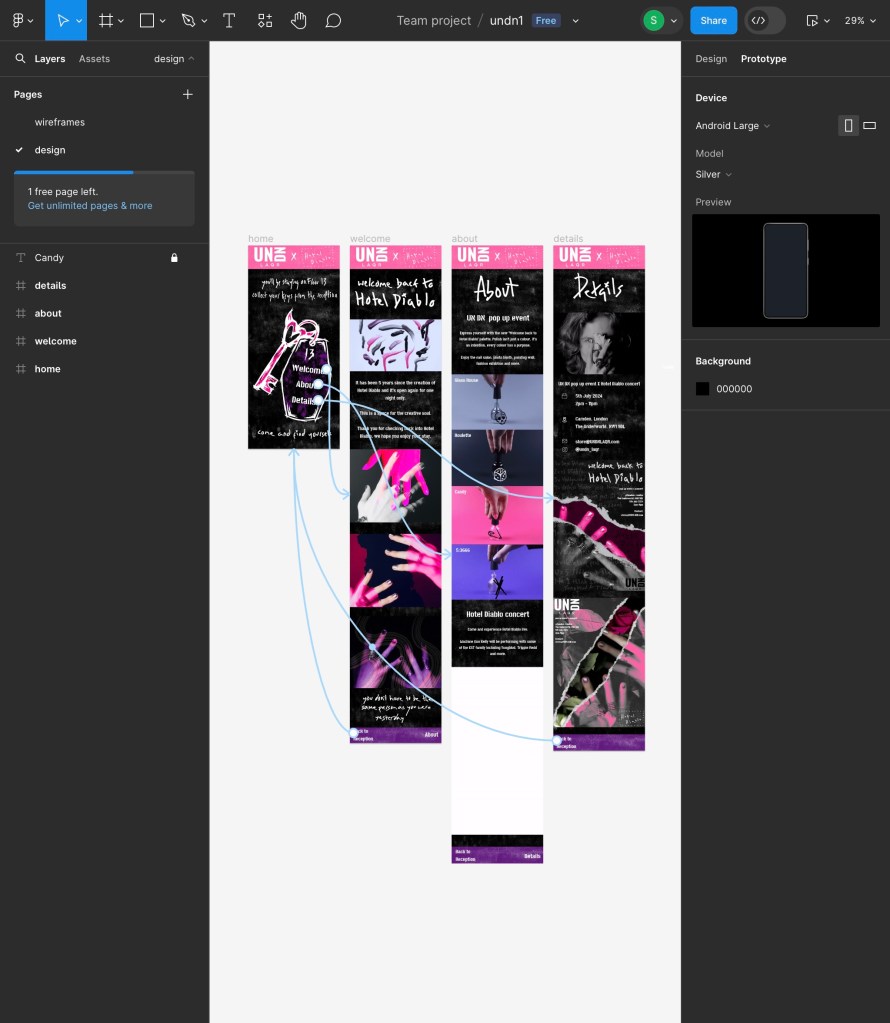Reflection: I learnt a lot through creating this interactive website. I learnt how to use Figma and about the fundamentals of designing a website. I’m very happy with how the final design came out. It successfully carries that visual identity from the posters and video. I think through the visuals, translations and audio I was able to create an immersive website that takes the viewer into the world on Hotel Diablo and the event.