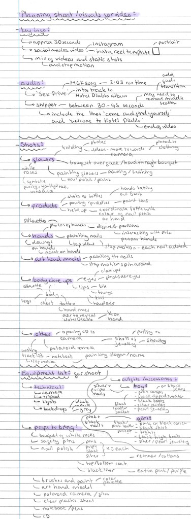 Planning: below is my planning of the visuals for the video and the photo shoot. Planning this in details before allows me to better utilise my limited time in the studio to get all the shots I wanted. The plan contains information about the videos format and audio. It also has ideas of what specific shots I wanted to achieve and a detailed equipment list. All the props and equipment was either mine or I bought specifically for the shoot. I did borrow a camera, tripod and a range of lighting options from the University.