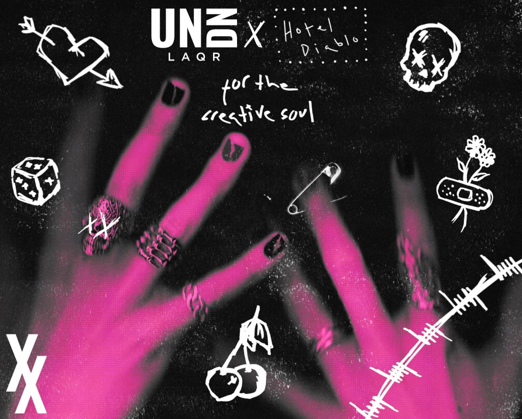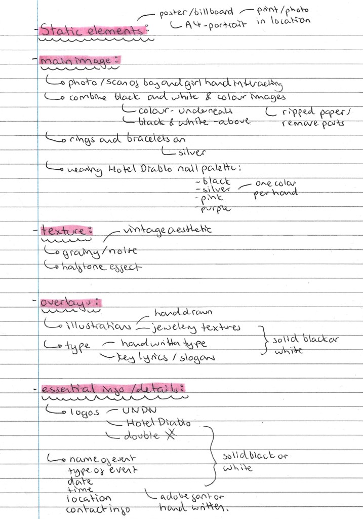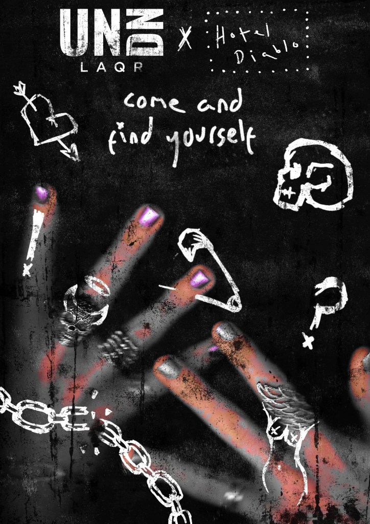 The idea behind the first poster was the have a male and female hand interlocking to represent the unisex nature in UN DN. The pink hand really catches your eye in comparison to the rest of the greyscale image. I wanted to draw the viewers attention this way then get them to look at the subtle details on the hand. I put my sketches over the hands almost like tattoos. This is also where the Hotel Diablo logo is on this poster, because I wanted it to be subtle and thought this was a unique way to display it.
