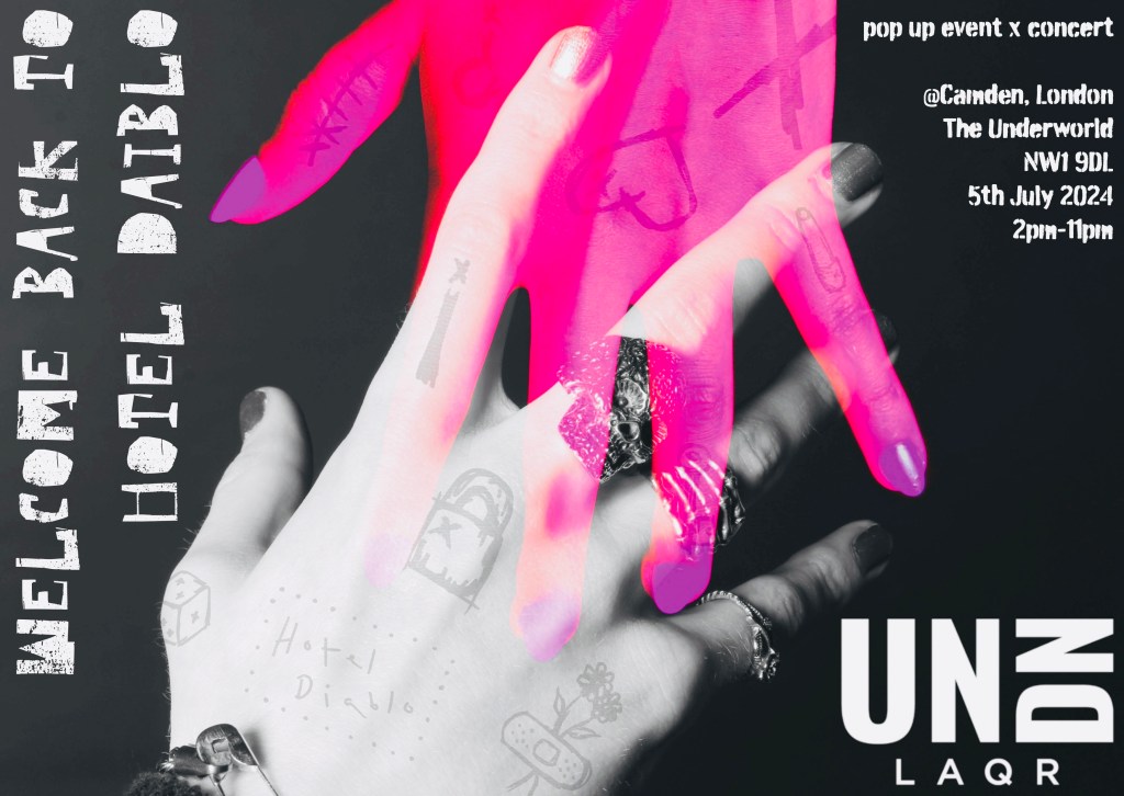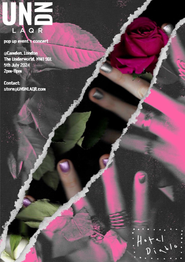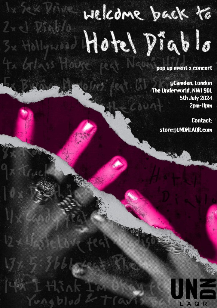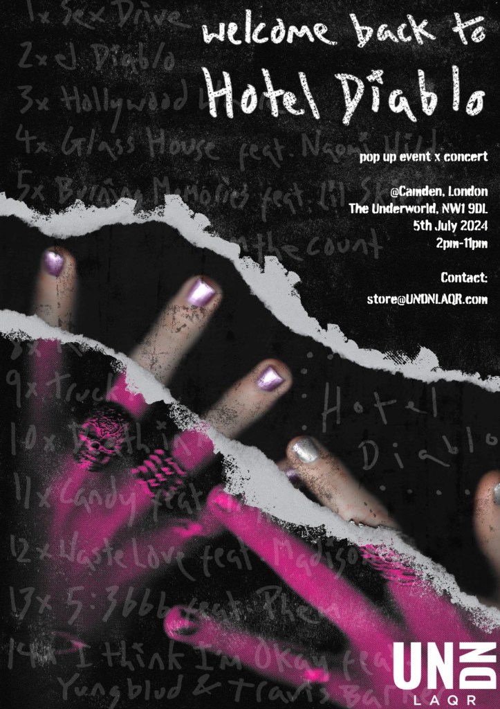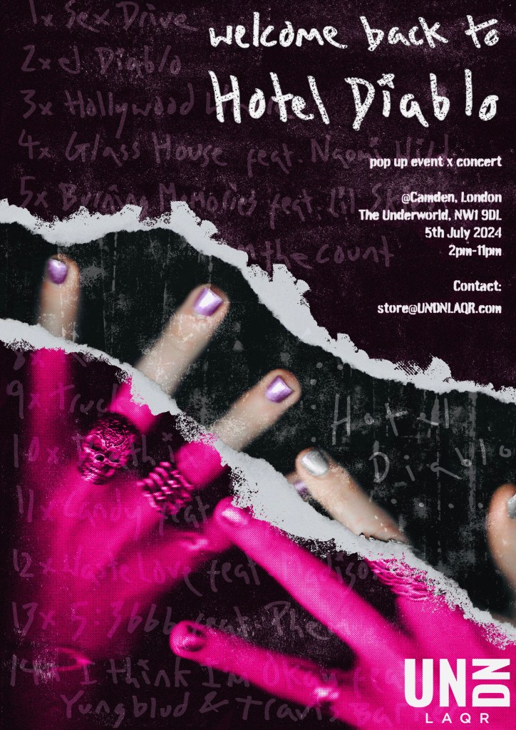The first 3 are variations of the same design, they just have the colour focused in different places. I think having different variations of the poster around Camden would be fun as people could try to find all the different ones. These posters have a dark, moody aesthetic heavily inspired by the Hotel Diablo aesthetic. The ripped paper allows for the nails to stand out, making sure the UN DN element of the event is not missed. The logo is visible in the bottom right. Some notable parts of the design is the track list written in my hand made typography running through the ripped paper. This is not too distracting but is a nice detail that fans of the album would be able to pick up on. Also the Hotel Diablo symbol is subtlety placed under the rip. The idea behind this is the paper is ripped to reveal the album and people’s expression and creatively through their nail design. Also the title of the event ‘Welcome back to Hotel Diablo’ is written in my typography and placed in the top right corner. The event details are written in an Adobe font called Burnaby that has a similar textured style to the rest of the poster.