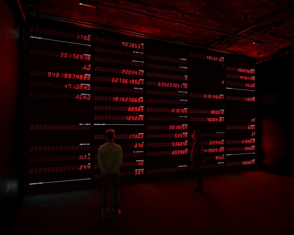 ‘Present Shock II’ by United Visual Artists (2023): This installation shows the viewer loads of statistical clocks and live news feeds representing real-time information from all around the world highlighting how the speed and volume of data in the Information Age. The continuous installation successfully creates the feeling of “information overload” with a tense, stressful and ominous atmosphere.