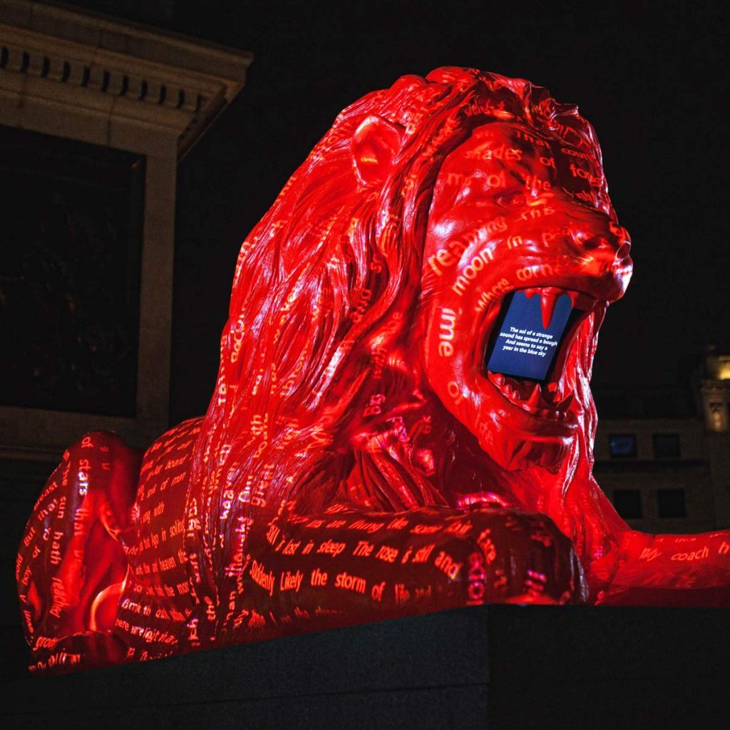 ‘Please Feed the Lions’ by Es Devlin [Interactive Poetry, Sculpture, Projection] (2018): This interactive installation in Trafalgar Square combines projection-mapped sculptures, fuse light, music & tech. The lion roared poetry, with the words being chosen by the public. The public were asked to “feed the lion” words. By daylight, the constantly changing collective poem was shown by LEDs in the mouth of the lion. By night, the poem was projection-mapped over the lion.