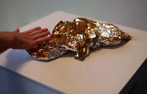 ‘@><#!!! the life of an overtaxed surface’ by Vera Hausmann, Till Maria Jürgens and Vitus Schuhwerk: A thin metal coated foil with invisible string is connected to servo-motors and an arduino board. This senses if somebody comes close. Through squeezing and releasing, the flat motion turns into a spatial transformation and expands towards the user. It reacts by proximity and physical interaction. The intensity of expression is determined by the user’s interaction. The foil reacts more intensely to more than one interaction. An arduino board controls the interaction.