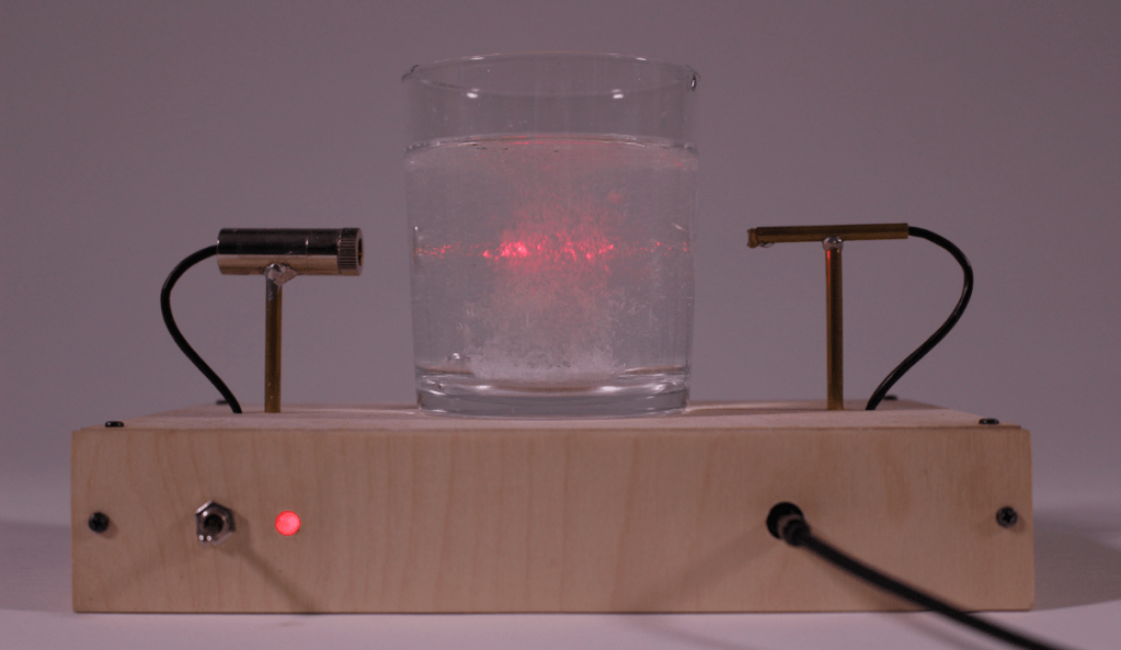 ‘Laser Microphone’ by Kai Lab: Laser Microphone acts like a microscope for sound, amplifying the physical vibrations of tiny objects that are otherwise too quiet to hear. This installation has been used to hear things such as the movement of insect wings, water spray and the movement of bubbles. A laser is used to illuminate a vibrating object. When the material of the object oscillates, it disrupts the beam of the laser and casts a shadow on a light sensor placed opposite the laser. The varying light intensity is translated into an electrical signal, which is amplified by an electrical circuit. This signal can then be fed into an audio playback device. The sound detected by the device is real-time and unprocessed.